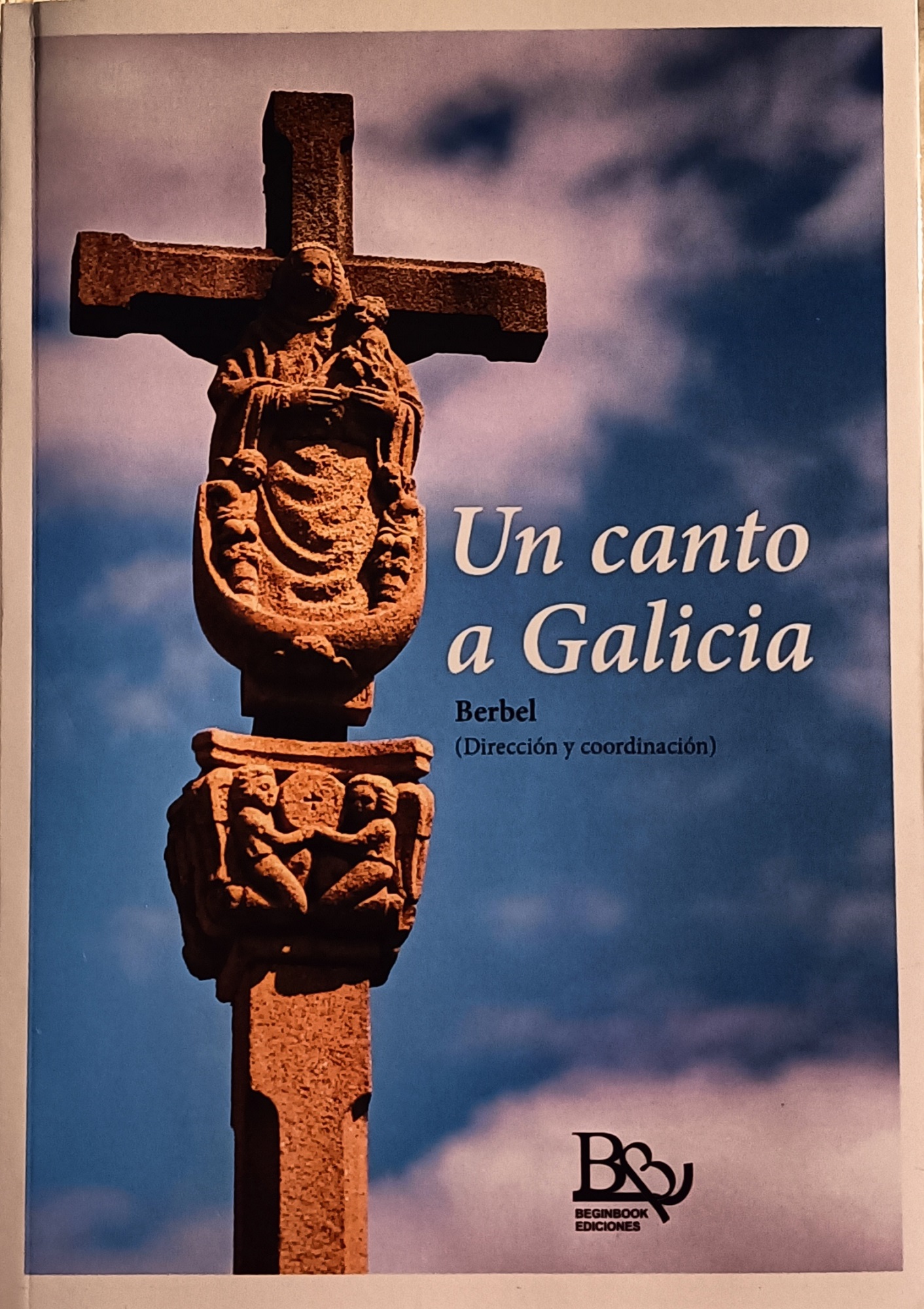 Junto al cruceiro, a su derecha, el título de la publicación: “Un canto a Galicia”. Bajo el título, la autora que dirige y coordina, Berbel -nombre con el que se conoce a una mujer de biografía extraordinaria: poetisa, narradora, pintora, ilustradora, guionista, directora de cine, educadora, investigadora literaria, fotógrafa… Su nombre María del Pino Marrero Berbel-.