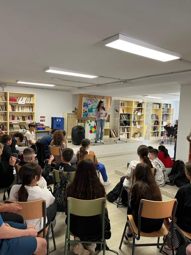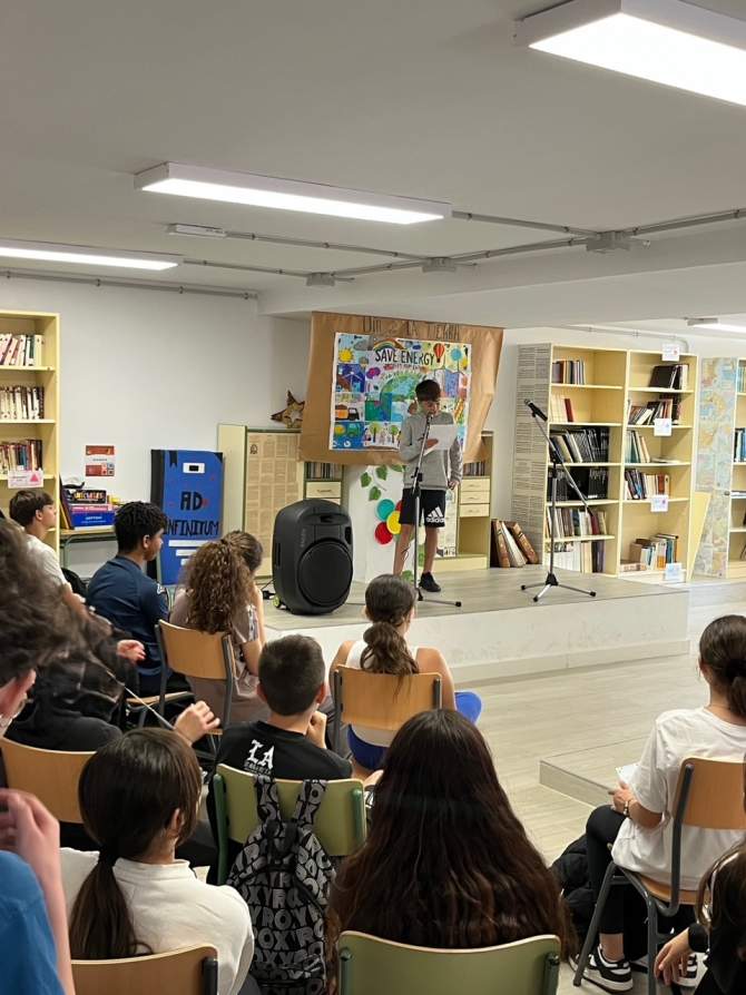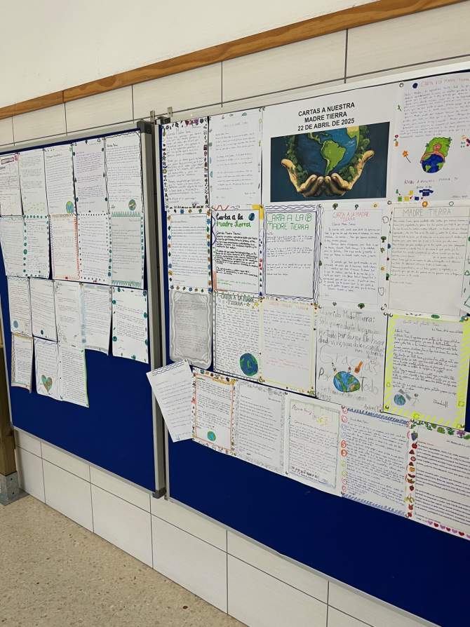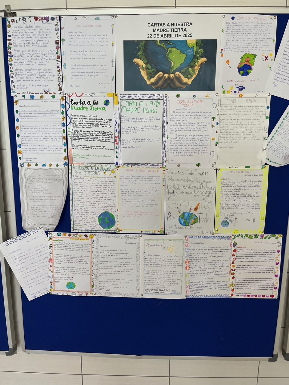 También quisieron hacer visible su agradecimiento al planeta por “el aire fresco que respiramos, por el agua cristalina que sacia nuestra sed y por los alimentos que nos nutren”. Para ello los alumnos redactaron cartas de agradecimiento a la madre Tierra, que fueron expuestas en el hall del centro y leídas este día durante el recreo en la biblioteca. Asimismo, el alumnado de 1º ESO elaboró un mural conmemorativo.