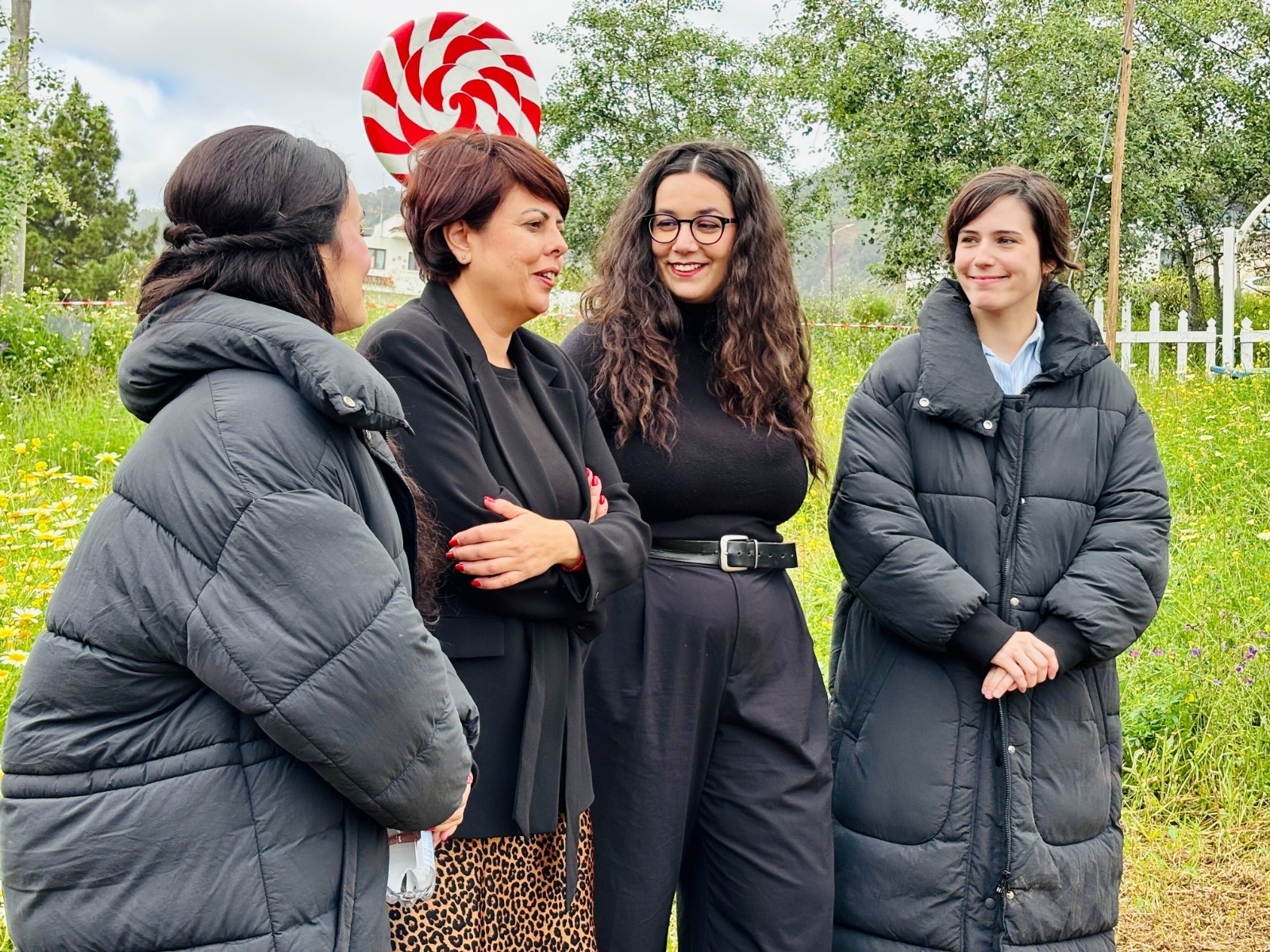 La visita tuvo lugar en una gran carpa circense instalada en Teror, donde se están filmando las escenas que recrean el mundo de la trapecista Pinito del Oro. Durante el encuentro, la consejera conoció al equipo artístico y técnico y presenció la grabación de una de las secuencias protagonizada por la trapecista Sarah Repond.