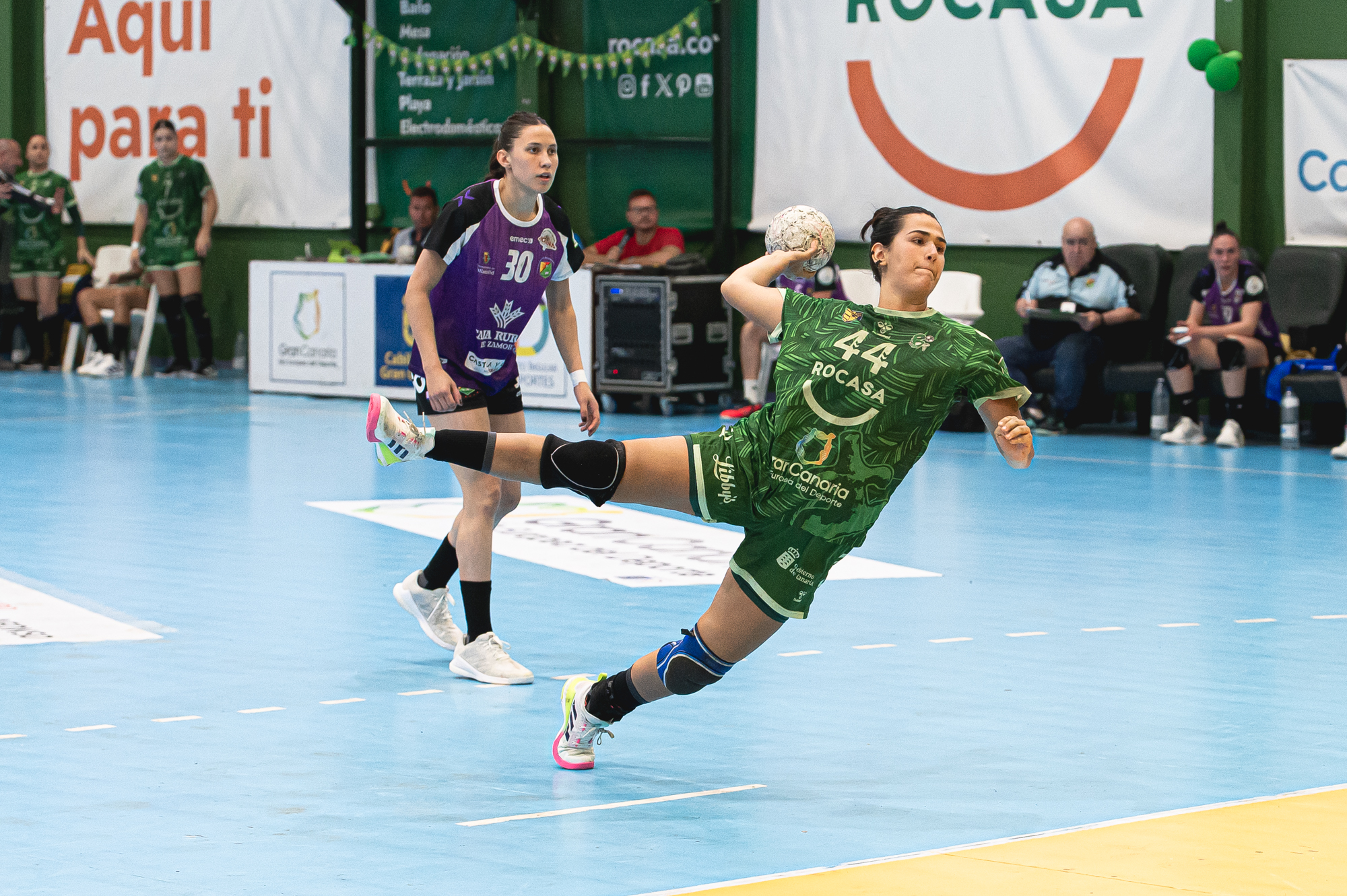Con Mela Falcón y María Zaldua liderando el ataque, y con una defensa férrea que apenas concedía opciones, las locales lograron un parcial de 14-5 en la segunda mitad que resultaría determinante. También brillaron en este tramo final jugadoras como Linnea Sundholm y Jhennifer Lopes, que aportaron dinamismo y frescura al entramado ofensivo canario.