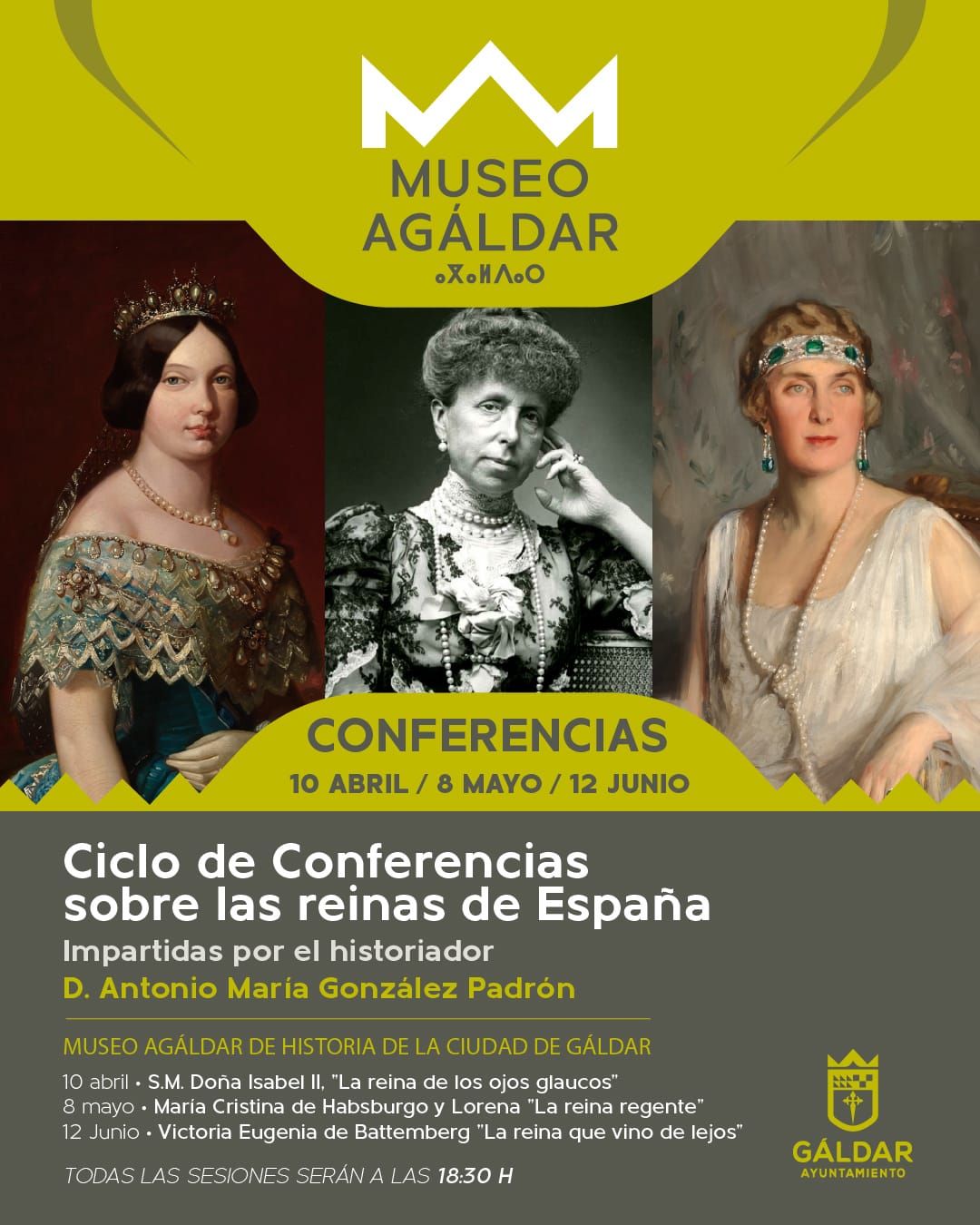El Museo Agáldar de Historia de la Ciudad de Gáldar continúa este jueves con un ciclo de conferencias dedicado a las Reinas de España, que se desarrolla en tres sesiones entre los meses de abril y junio. Estas conferencias las imparte el reconocido historiador y cronista de Telde, Antonio María González Padrón, también académico correspondiente de la Real de la Historia.