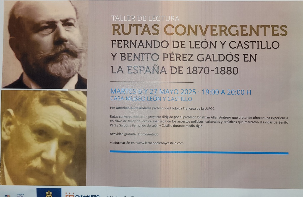 Continúa el ciclo Rutas Convergentes con la expectativa de descubrir, leer y escudriñar la España del XIX e inicios del XX de la mano del profesor Allen y de dos grandes de aquella España por la que hoy transitamos, Fernando León y Castillo y Benito Pérez Galdós, desde esta Casa Museo de Telde que dirige José Alejandro Díaz, dependiente de la Consejería de Cultura del Cabildo de Gran Canaria, que ofrecerá en el taller de lectura el seguimiento de lo expuesto en otra ponencia y lecturas el martes 27 de mayo. Enhorabuena a Jonathan Allen por esta nueva iniciativa y el agradecimiento a la dirección de la Casa Museo León y Castillo de Telde. Gracias.