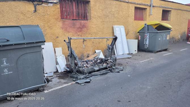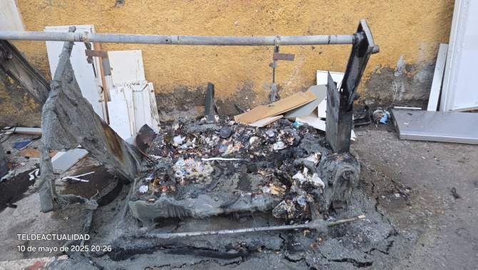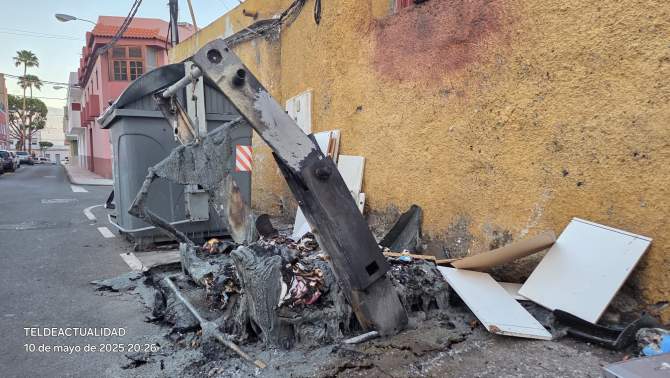Contenedor calcinado por el fuego en la calle de Matías Moreno/TA/DNT.Un contenedor de plástico para residuos domésticos ardió este sábado al mediodía en la calle Matías Moreno, en las inmediaciones de la calle Doctor Castro Viejo, en Telde. El incendio movilizó a los bomberos del parque zonal de Telde, quienes enfrentaron dificultades para acceder al lugar debido a la estrechez de la vía y a vehículos mal estacionados.