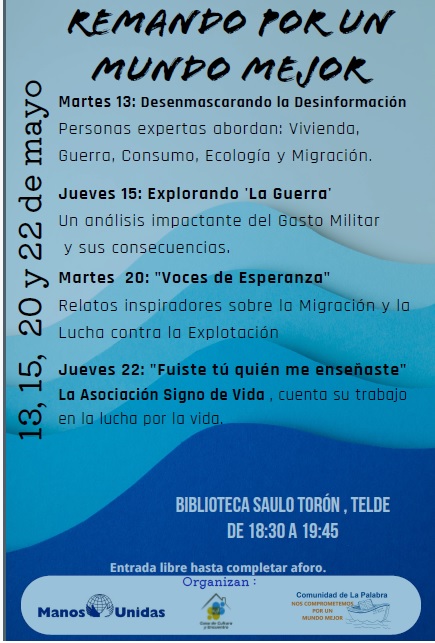 Telde será escenario este mes de mayo de las jornadas ‘Remando por un mundo mejor’, una iniciativa impulsada por Manos Unidas, Casa Cultura y Encuentro y la Asociación Comunidad de La Palabra, que busca crear espacios de diálogo y reflexión sobre temas sociales de gran relevancia.
