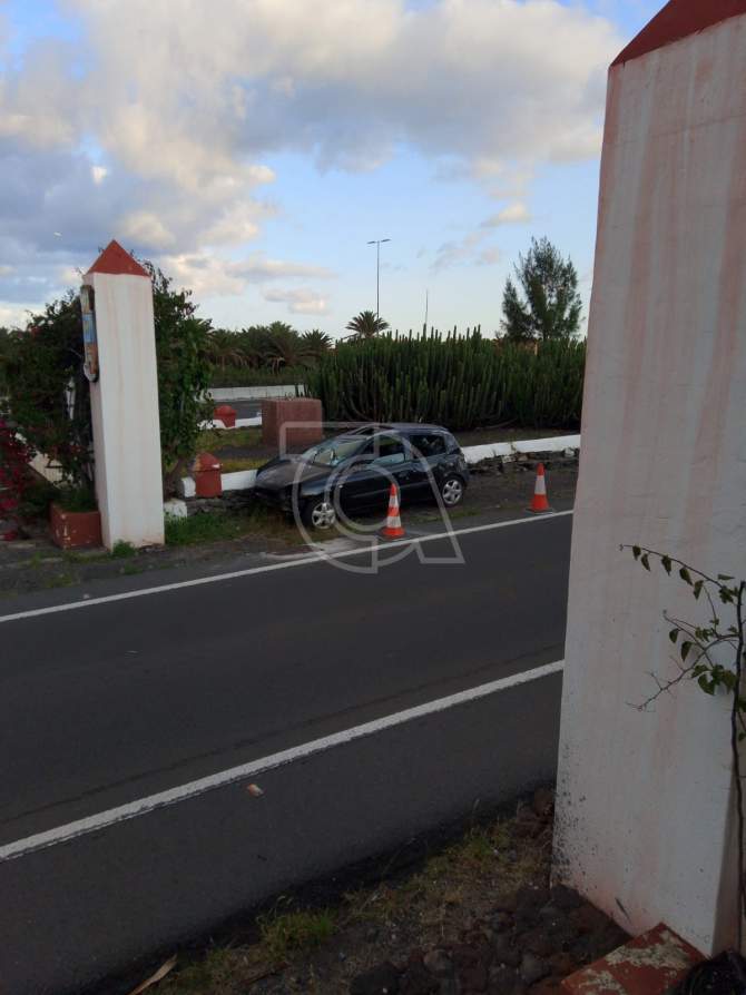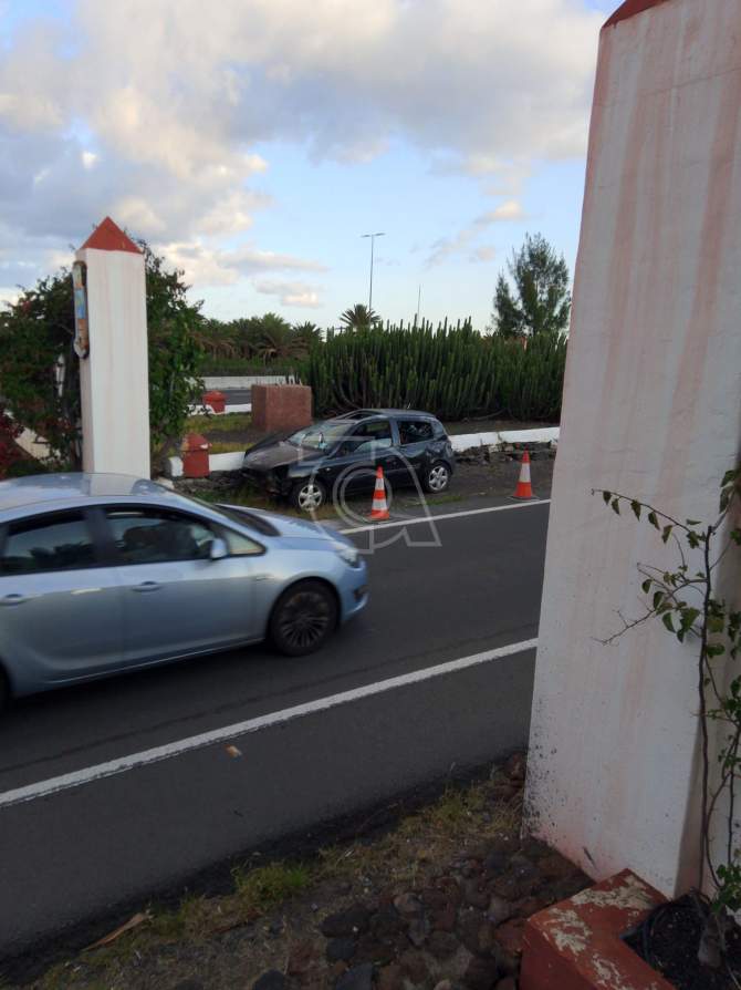 Un vehículo accidentado, con importantes daños visibles, permanece abandonado en el acceso a la Avenida del Cabildo desde la GC-1, en la entrada a Telde, a la altura de Las Remudas y el monumento al Faro de Maspalomas, tras sufrir un siniestro en la madrugada de este sábado 17 de mayo.