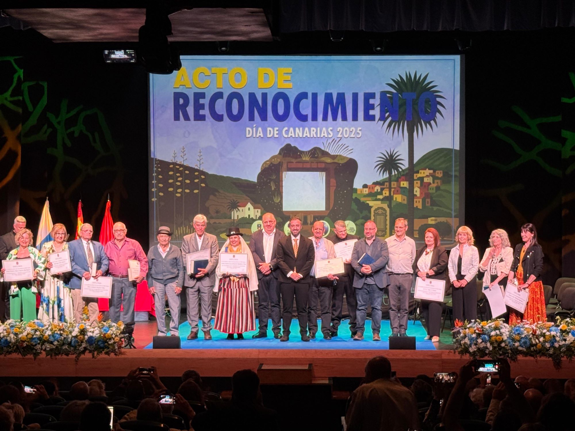 El Teatro Municipal Juan Ramón Jiménez vivió este viernes una noche cargada de emoción, orgullo y canariedad con la celebración del acto institucional de entrega de distinciones a personas y colectivos que han dedicado su vida a la preservación, promoción y defensa de la cultura popular canaria. El evento, organizado por el Ayuntamiento de Telde, a través de la Concejalía de Cultura, con motivo del Día de Canarias, contó con una destacada participación ciudadana.
