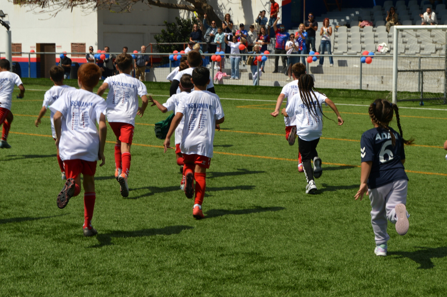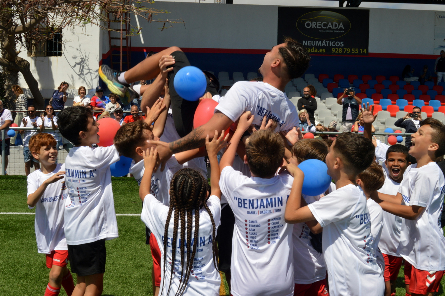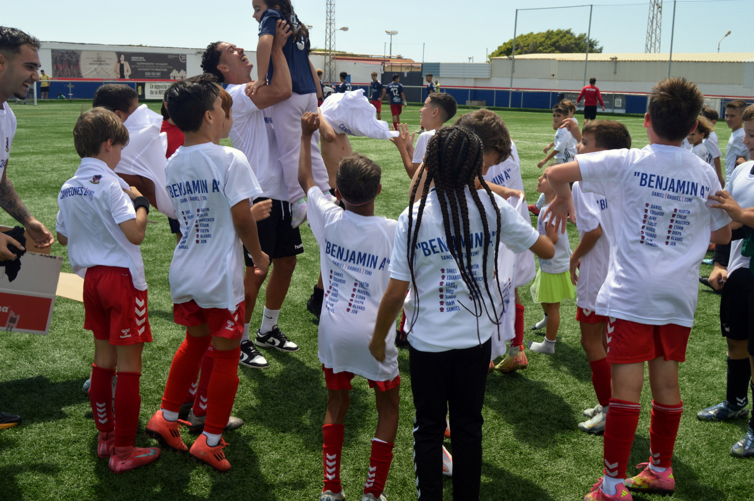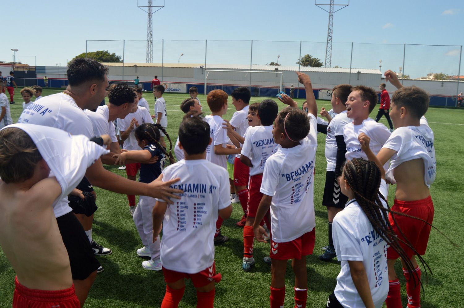 Padres y niños del equipos celebran el éxito en El Hornillo (Foto: Juan Antonio Hernández)El equipo benjamín A de la Unión Deportiva Telde se proclamó el pasado sábado campeón del grupo B de la segunda fase A (sic) al derrotar por 10-1 al CD Maspalomas Training en el estadio Pablo Hernández Morales, sumándose a los primeros puestos conseguidos por el cadete B y el infantil C en semanas recientes.