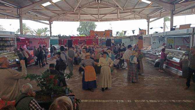 El Mercado Municipal de Telde se vistió de tradición este miércoles con motivo de la celebración anticipada del Día de Canarias. En un ambiente festivo y cercano, los clientes del recinto provisional de Narea pudieron disfrutar de una actuación folclórica a cargo del reconocido grupo Gran Faycán, acompañado de su cuerpo de baile.