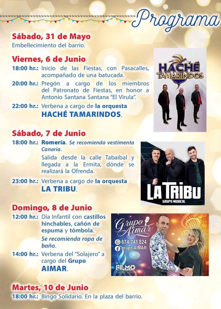 El programa festivo se cierra el 15 de junio con una misa en la ermita a las 12.00 horas, seguido por la procesión del santo por las calles del barrio. Al culminar habrá una verbena del solajero con el grupo Luz de Luna. El fin de fiesta llega a las 20.00 horas con la reproducción del documental en honor a Antonio Santana ‘El Virula’.