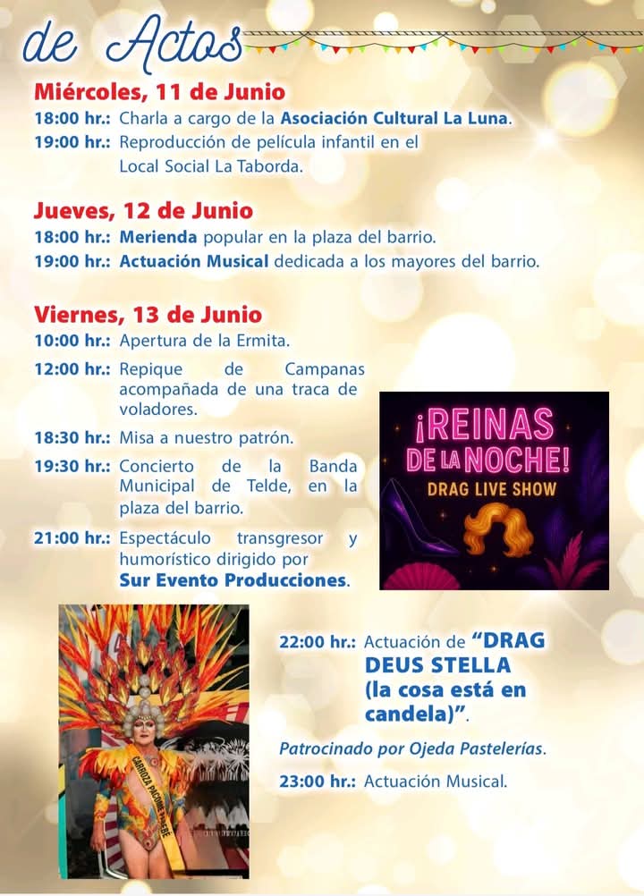 El día grande de los festejos, el 13 de junio, habrá repique de campanas acompañada con una traca de voladores a las 12.00 horas, una misa a las 18.30 horas, un concierto de la Banda Municipal de Música de Telde y un espectáculo transgresor y humorístico. A las 22.00 horas está prevista la actuación de Drag Deus Stella, seguido por una actuación musical.