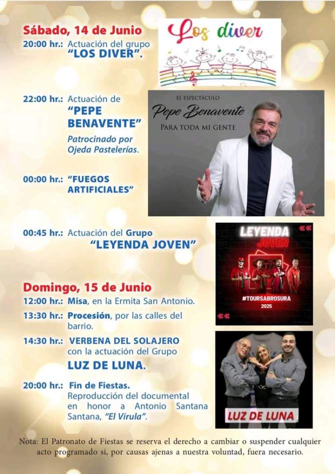 El sábado 14 de junio habrá una actuación del grupo Los Diver a las 20.00 horas y la actuación de Pepe Benavente. A la medianoche serán los fuegos artificiales seguido de la actuación de Leyenda Joven.