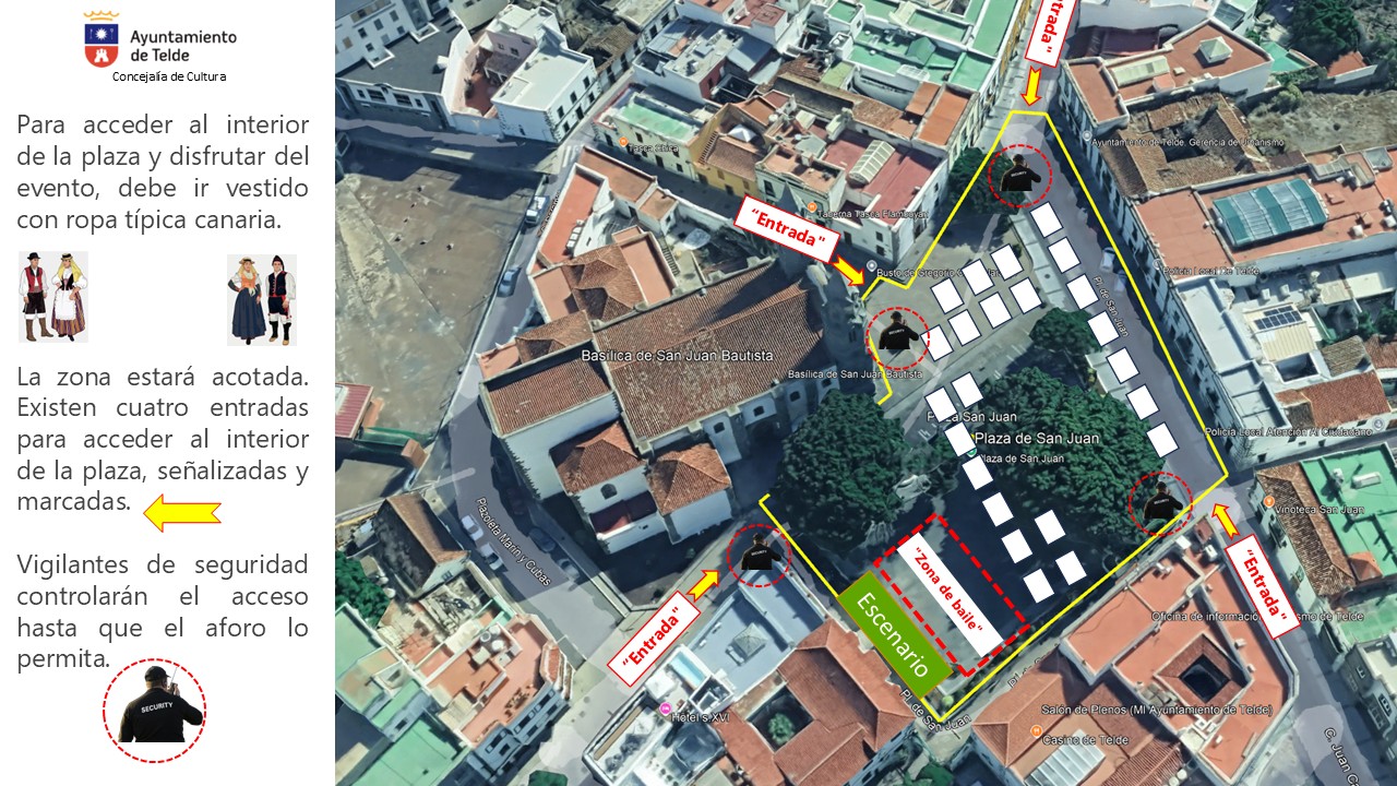 Se recuerda que para asistir es imprescindible acudir ataviados con vestimenta tradicional canaria, y que habrá controles de acceso en las entradas del recinto acotado para el evento.