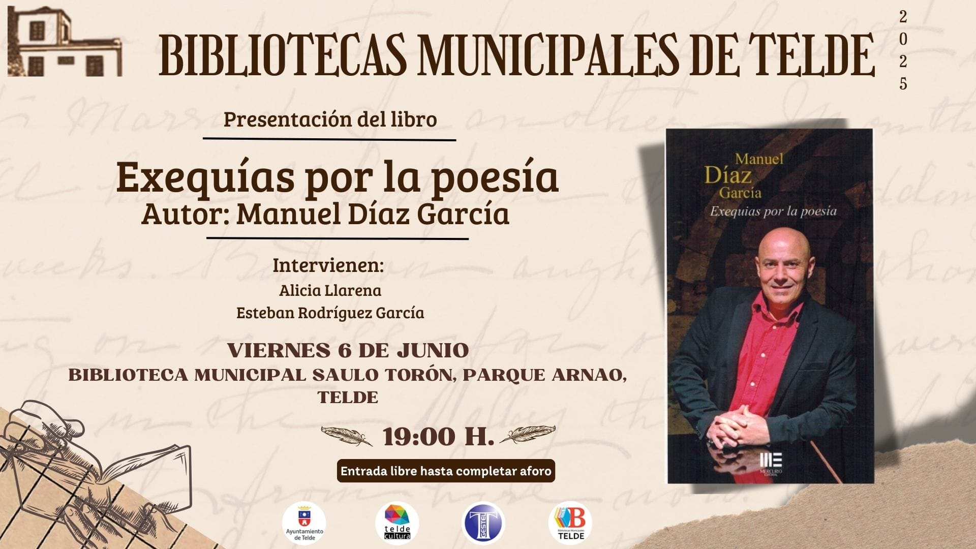 La Biblioteca Saulo Torón del Parque Arnao acogerá este viernes, día 6 de junio, la presentación, a partir de las 19.00 horas, del poemario Exequías por la poesía, de Manuel Díaz García. El autor contará con la participación de la catedrática Alicia Llarena y del coach Esteban Rodríguez.