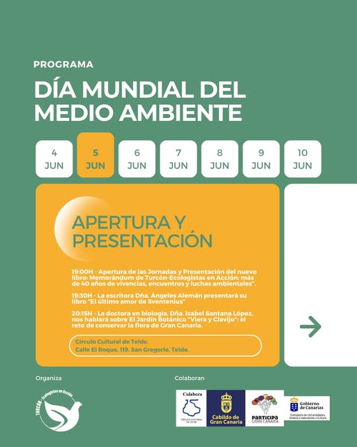 Estas actividades cuentan con la colaboración del Círculo Cultural de Telde, la Dirección General de Cultura y Patrimonio del Gobierno de Canarias y la Consejería de Participación Ciudadana del Cabildo de Gran Canaria, instituciones que Turcón ha querido agradecer públicamente por su respaldo al activismo ambiental.
