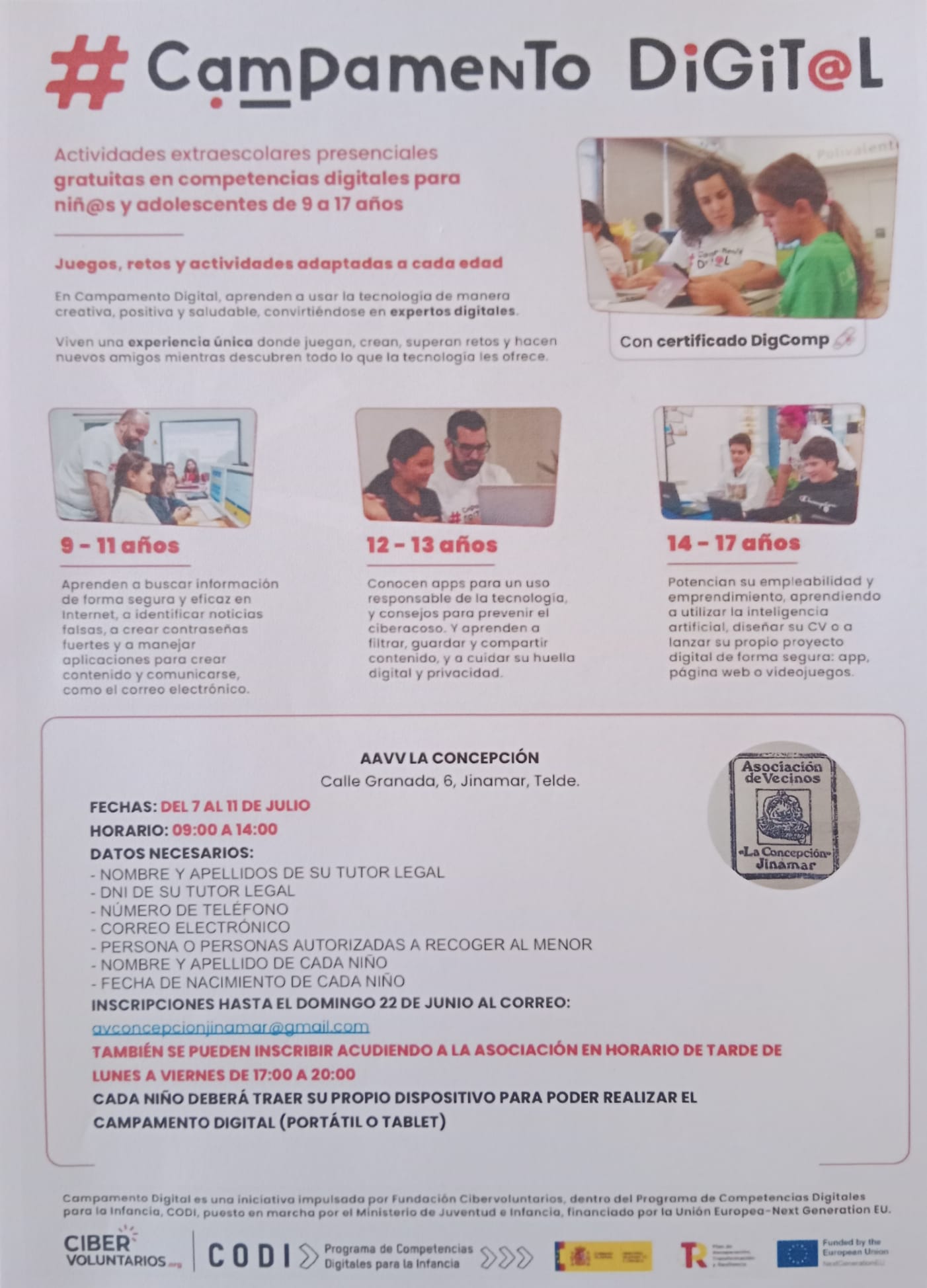 Del 7 al 11 de julio de 2025, la Asociación de Vecinos La Concepción, en Jinámar (Telde), será sede del Campamento Digital, una actividad totalmente gratuita destinada a niños, niñas y adolescentes de entre 9 y 17 años. Se trata de una propuesta educativa que combina tecnología, creatividad y juego para convertir a los más jóvenes en verdaderos expertos digitales.