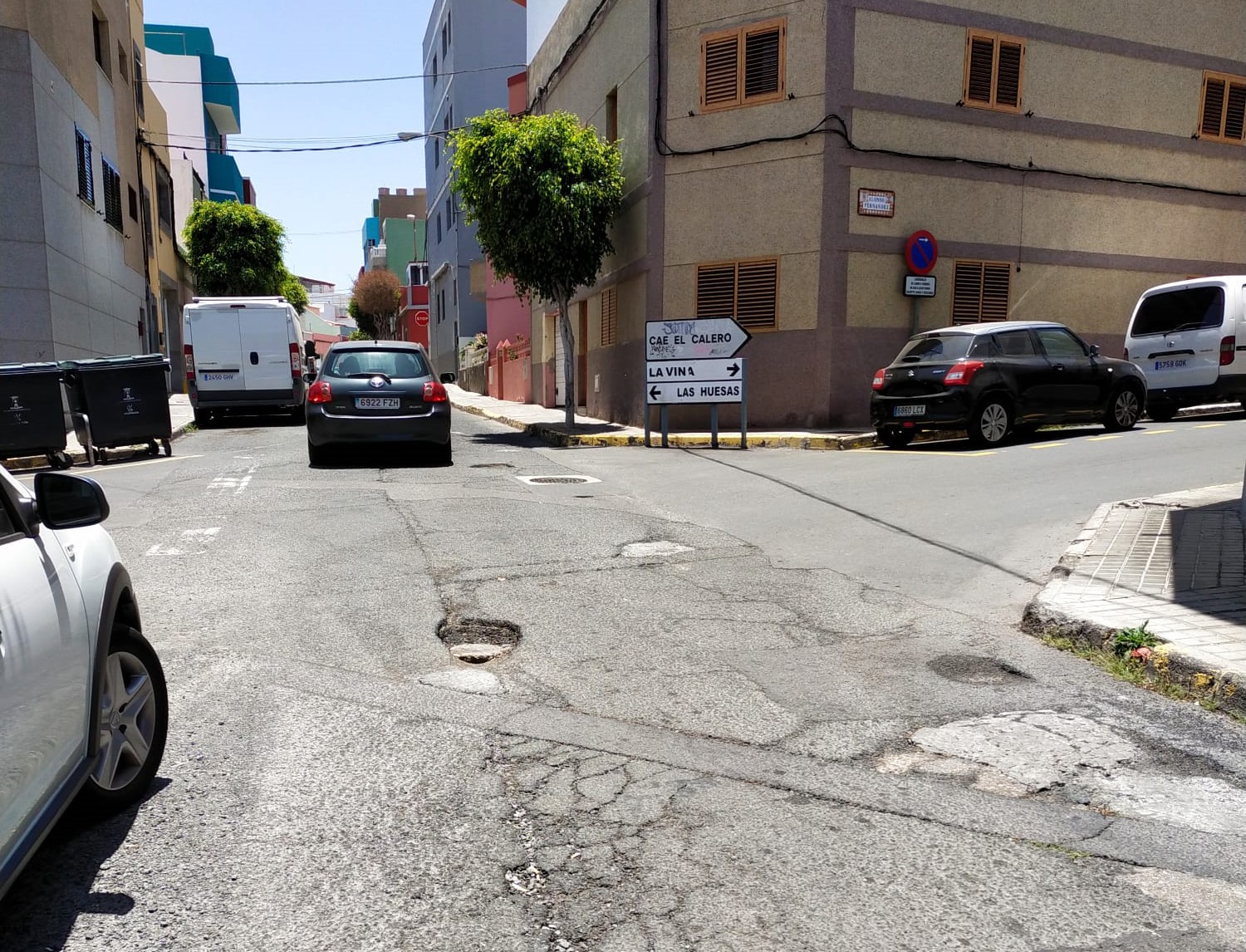 Entre las vías más afectadas se encuentra la calle Tenesoya, especialmente en el tramo situado frente a la freiduría Mejías, donde los socavones visibles y el firme irregular dificultan el tránsito de vehículos y generan un riesgo tanto para conductores como para peatones. “Llevan así mucho tiempo y nadie viene a arreglarlo”, señala una vecina afectada.