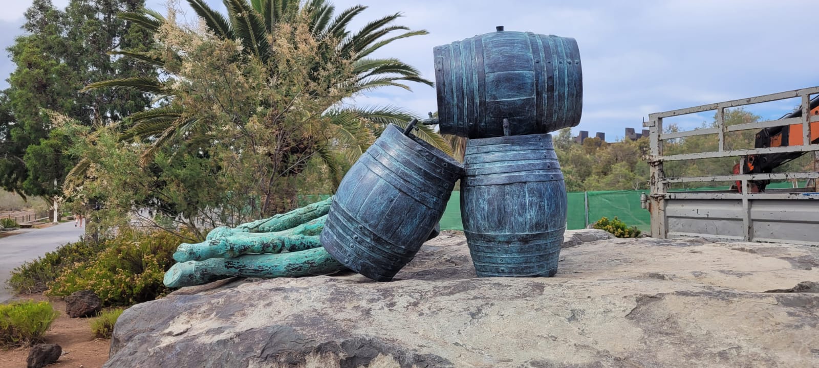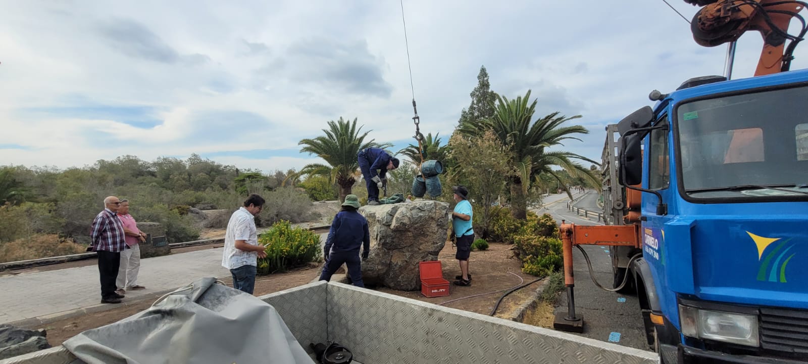 La mañana del viernes 13 día de San Antonio de Padua nos encontramos en el entorno de la Reserva Natural Especial del sistema dunar, en el lateral derecho de norte a sur del Barranco o Canal de Maspalomas, entrada sur a los jardines de interés turístico del Parque Tony Gallardo, en el lugar donde se procedió a la restauración del monumento escultura Agua y leña, inaugurada en 2002 y vandalizada después por el robo de uno de sus elementos.