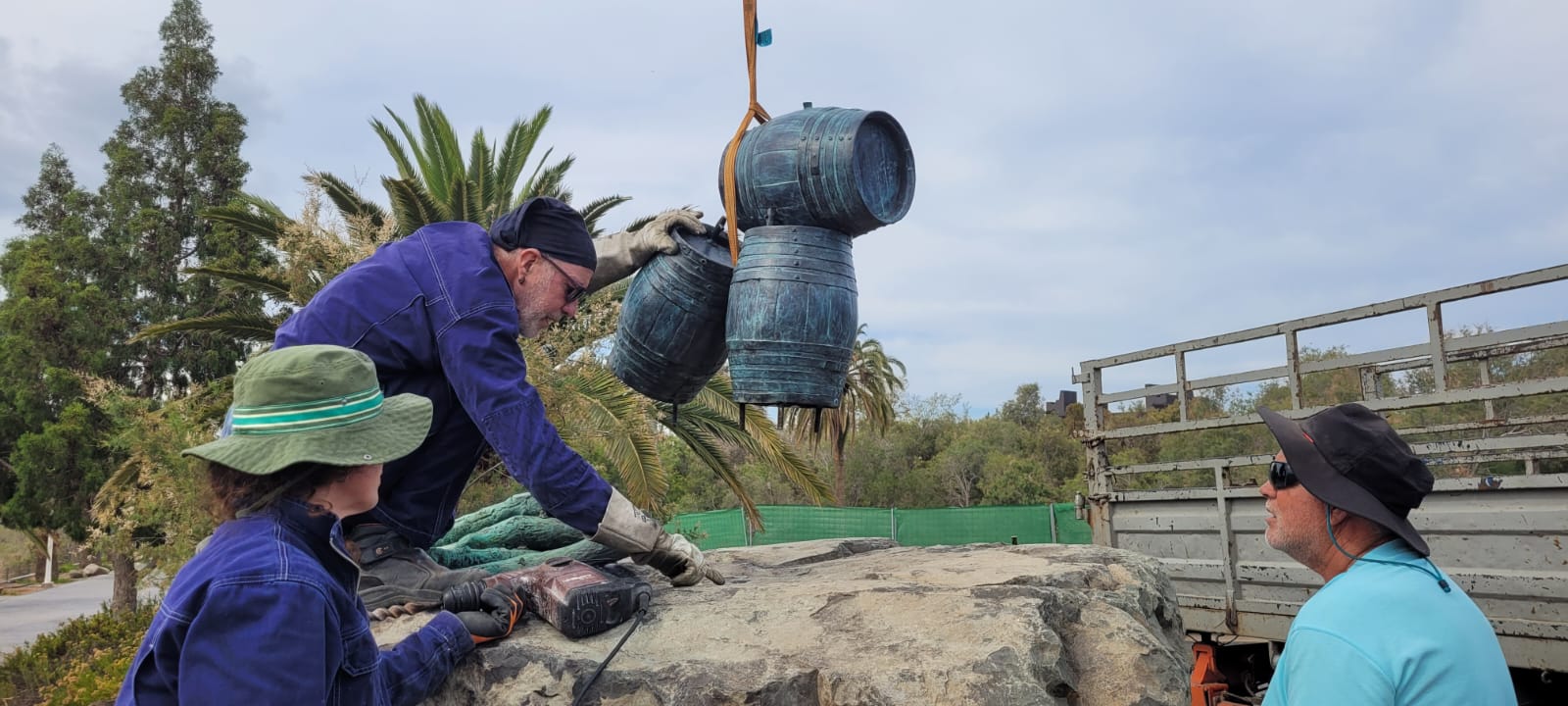Alrededor del trabajo de fijar la nueva pieza, observando a los operarios y representantes del municipio de San Bartolomé de Tirajana, leo las inscripciones que en tres idiomas se fijan al pie en la base de una enorme roca de basalto sobre la que se eleva la escultura, tres toneles y un haz de leña: Desde este lugar partió Colón en su último viaje a las nuevas islas de las Canarias indianas (América) el 25 de mayo de 1502. En conmemoración del V Centenario de Colón en su parada en Maspalomas 1502-2002.