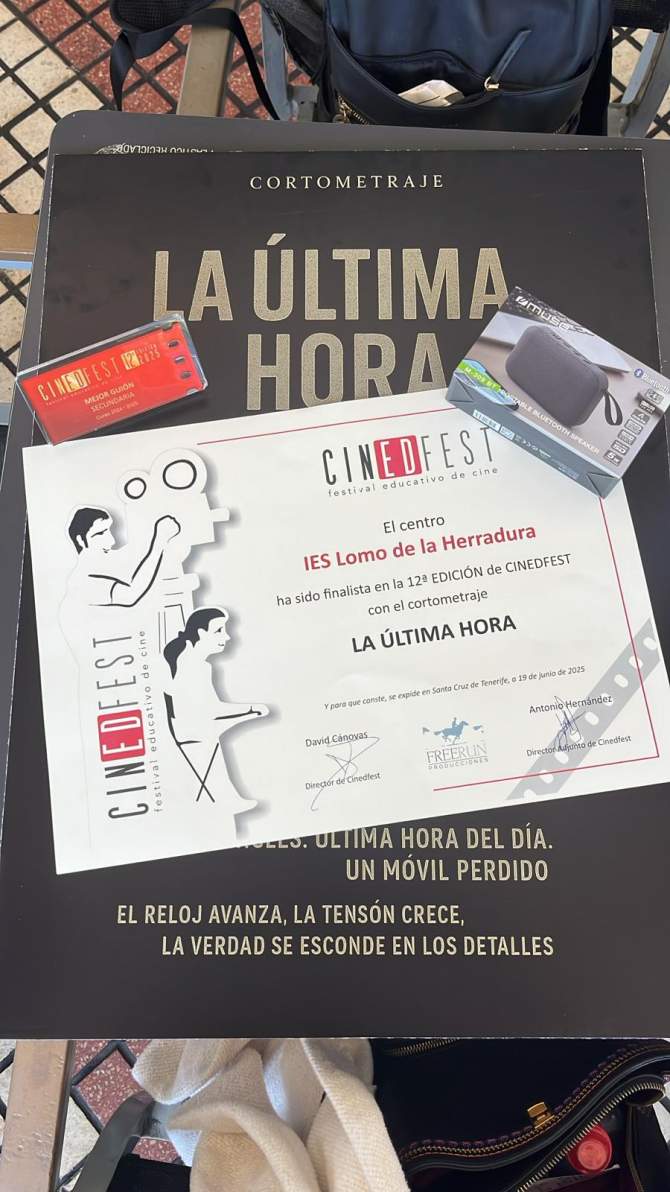 El IES Lomo de La Herradura ha ganado el premio al mejor guion de la 12ª edición del Festival de Cine Escolar Cinedfest, en la categoría de Educación Secundaria, con el corto La última hora.