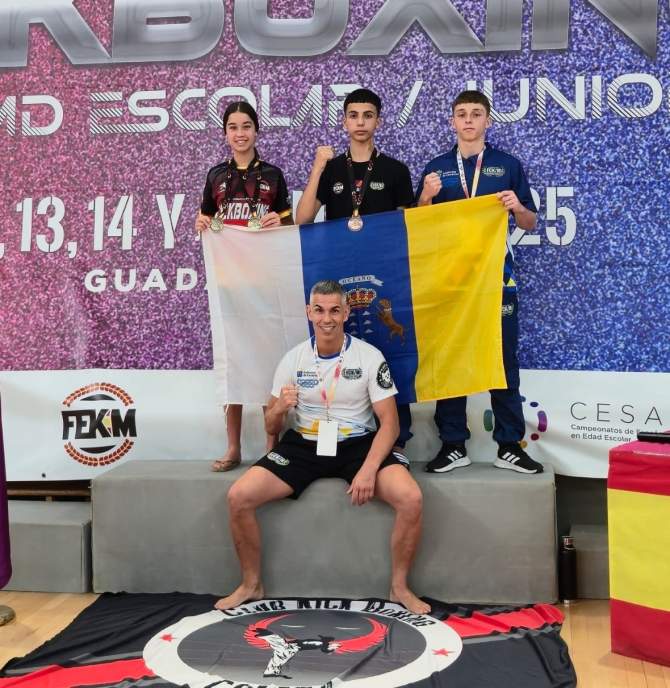 El concejal de Actividad Física y Deportes del Ayuntamiento de Telde, Cristhian Santana Caballero, felicita a la representación teldense del Club Kickboxing Coleta por los magníficos resultados obtenidos en el Campeonato de España de Kickboxing en Edad Escolar - Junior 2025, en categoría escolar.