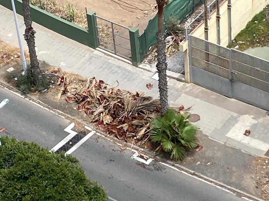 Vecinos de Jinámar han denunciado el abandono de una zona ajardinada en la calle Ídolo, a la altura de los huertos comunitarios y la zona deportiva, donde palmeras abanico carecen de riego y mantenimiento, acumulando hojas secas que caen con frecuencia.