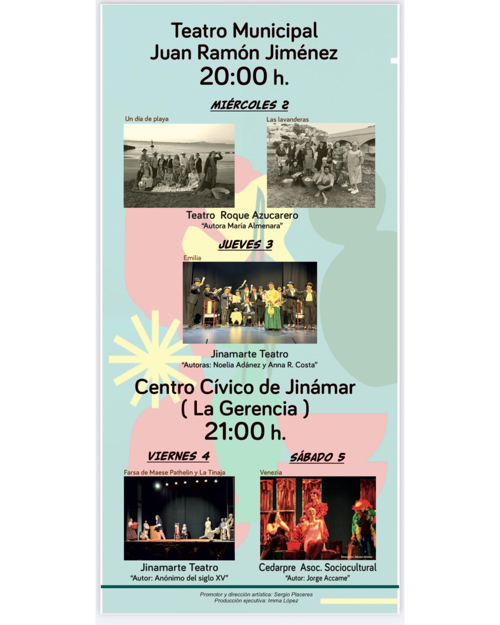 En el Teatro Municipal Juan Ramón Jiménez, el grupo Teatro Roque Azucarero representará el miércoles día 2 de julio (20.00 horas) las obras Un día de playa y Las Lavanderas, cuya autora es María Almenara. El jueves día 3 de julio, a la misma hora y en el mismo recinto, Jinamarte Teatro pondrá en escena la obra Emilia, de Noelia Adánez y Anna R. Costa.