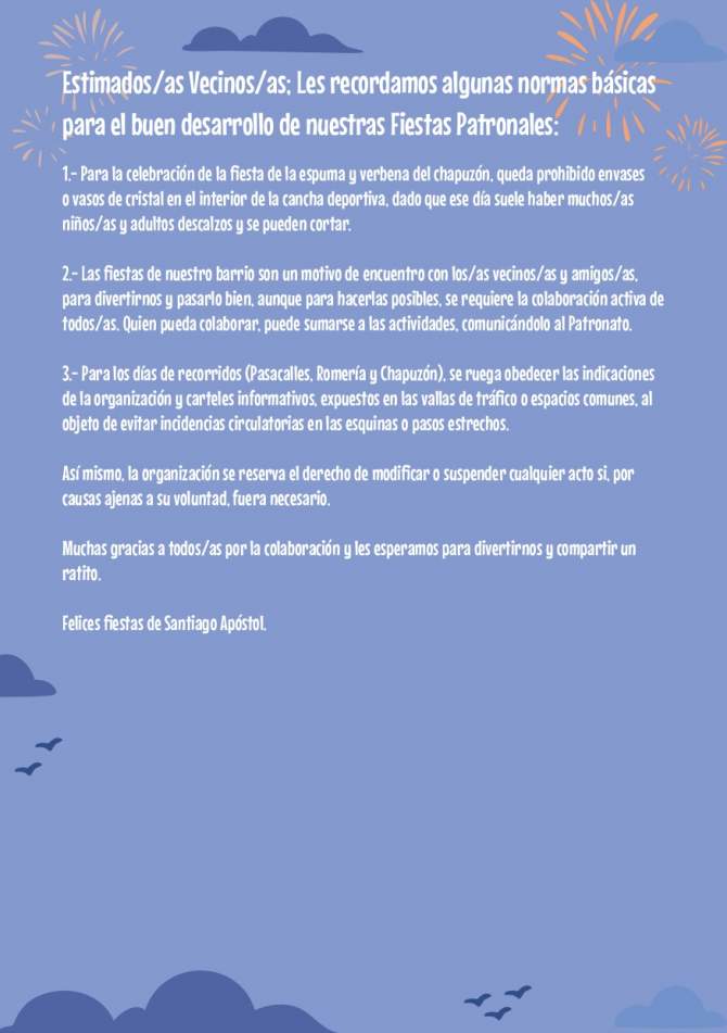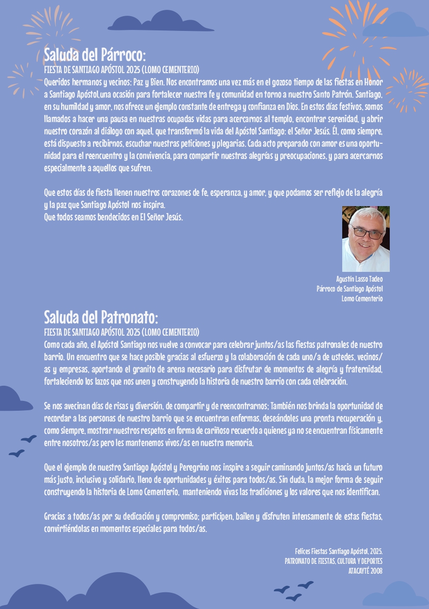 El párroco Agustín Lasso ha exhortado a vivir estas fechas como ocasión de recogimiento espiritual y reencuentro comunitario, siguiendo el ejemplo de humildad y entrega del Apóstol. El Patronato de Fiestas ha agradecido la implicación vecinal y ha recordado la importancia de respetar las indicaciones organizativas para el buen desarrollo de los actos.