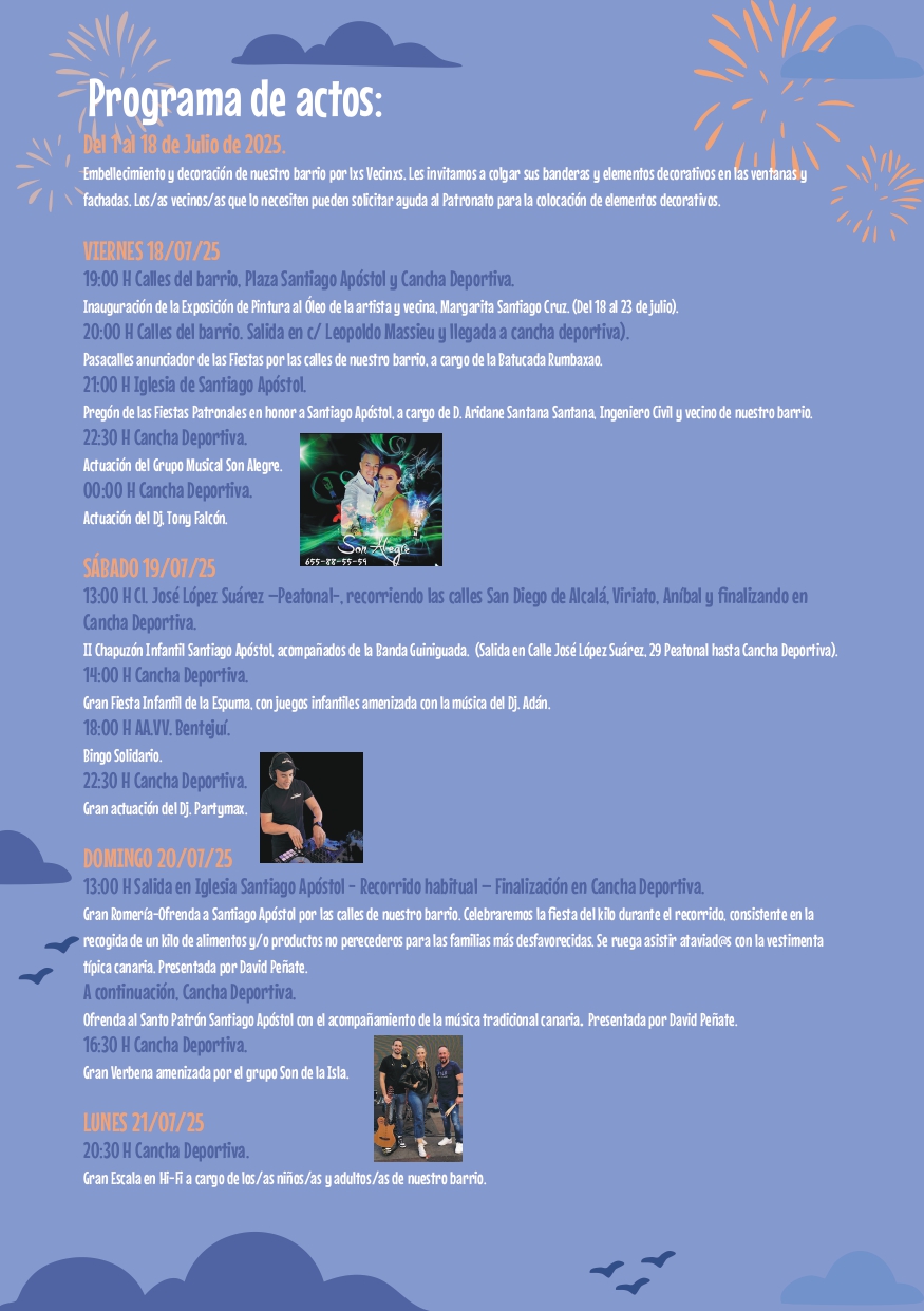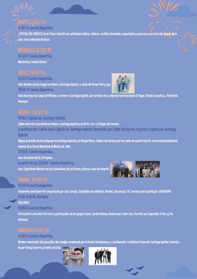El viernes 25, solemnidad de Santiago Apóstol, se celebrará la misa y procesión acompañada por la Banda Municipal de Música de Telde. Esa misma noche tendrá lugar el espectáculo musical protagonizado por Los Asere y Nueva Línea, tras la actuación del DJ Partymax.