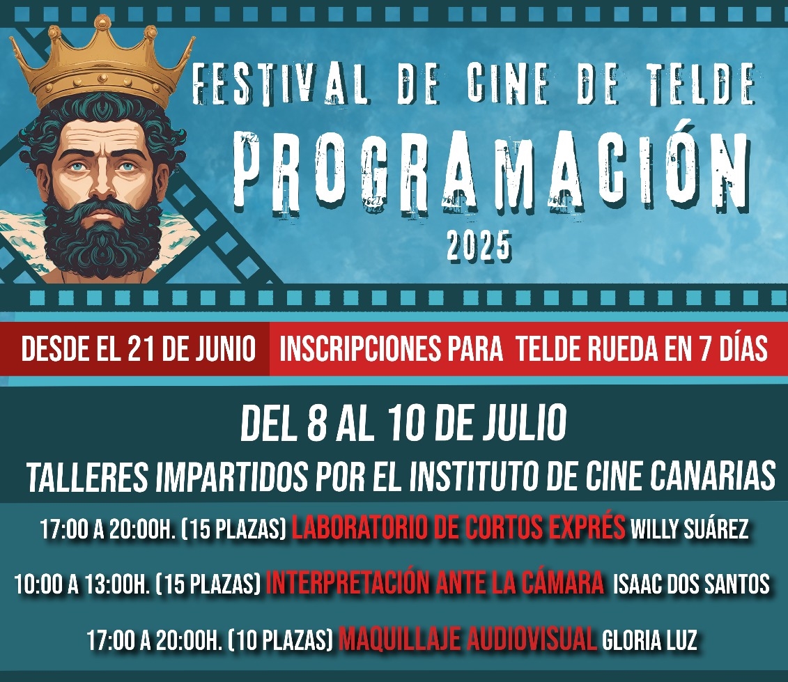 Del 8 al 10 de julio se impartirán diferentes talleres, de la mano de profesionales del Instituto de Cine Canarias. Todos ellos son cursos divididos en tres jornadas de tres horas cada una (un total de nueve horas), con plazas limitadas y con un precio de 10 euros por taller. Las inscripciones se pueden gestionar a través de www.institutodecinecanarias.es/festival-telde.