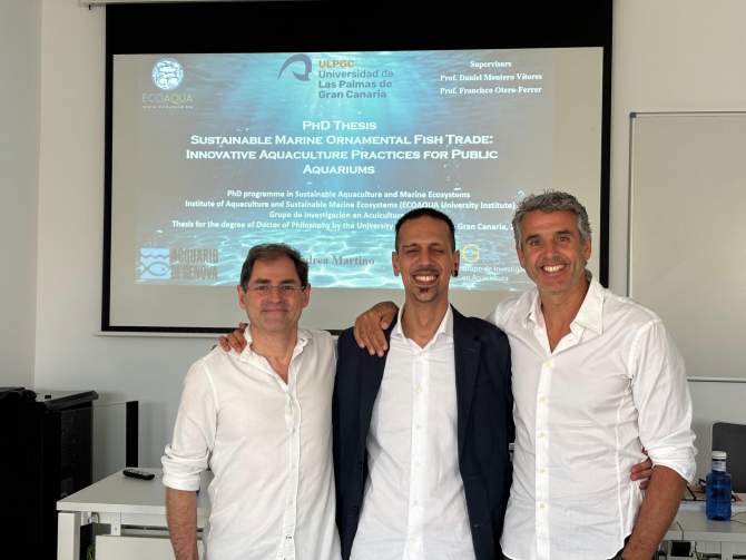 El estudio, fruto de una tesis universitaria presentada recientemente en ECOAQUA, lleva como título Comercio Sostenible de Peces Ornamentales Marinos: Prácticas Innovadoras de Acuicultura para Acuarios Públicos, es obra del investigador Andrea Martino, acuarista del acuario de Génova (Italia), y está dirigida por los doctores universitarios Daniel Montero, miembro del Grupo de Investigación en Acuicultura (GIA) del instituto universitario, y Francisco Otero-Ferrer, miembro del grupo Biodiversidad y Conservación (BIOCON), también de ECOAQUA.
