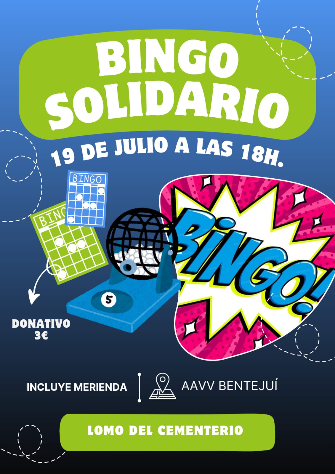 La Asociación de Vecinos Bentejuí, en Lomo Cementerio, acoge este sábado, día 19 de julio un bingo solidario. Será a partir de las 18.00 horas, con un donativo de 3 euros y se incluye merienda.