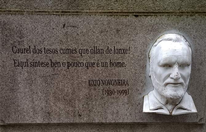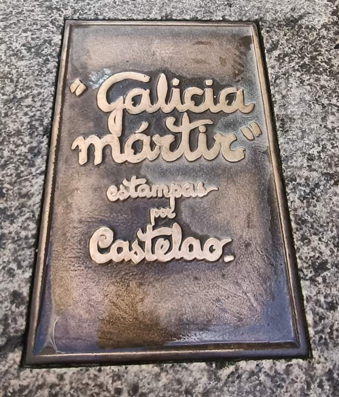 Alrededor de él, sobre el suelo mojado, losetas metálicas con los títulos de algunas de sus publicaciones más destacadas: “Os vellos non deben de namorarse”, “Galicia mártir”, estampas por Castelao, “Nos” por Castelao