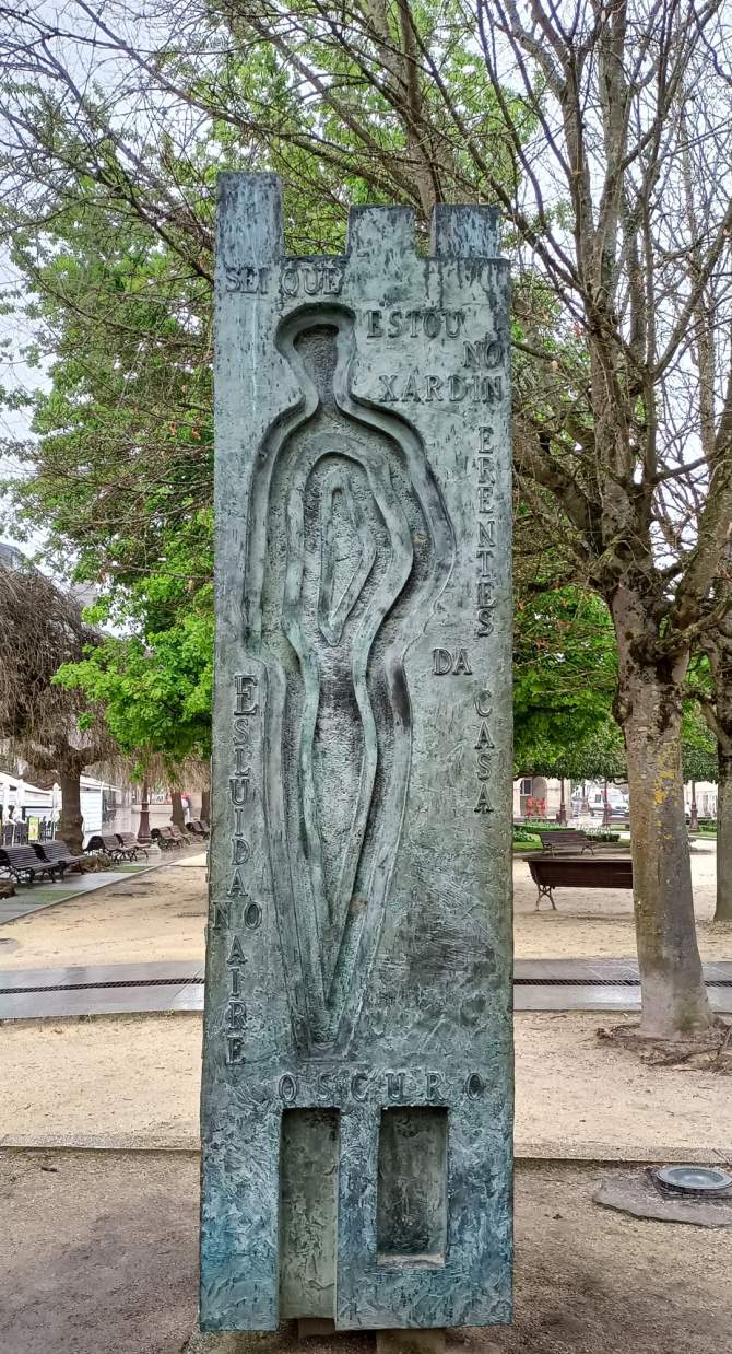 Completa el recorrido escultórico en estos jardines, otra placa granítica hincada en el suelo. A modo de estelas, está claro que estas grandes losas son del gusto del ciudadano lucense pues son varias como hemos visto las que, a lo largo de todo el recorrido, muestran su reconocimiento y gratitud a diversos hitos históricos, a personajes literarios o artísticos o a textos literarios…