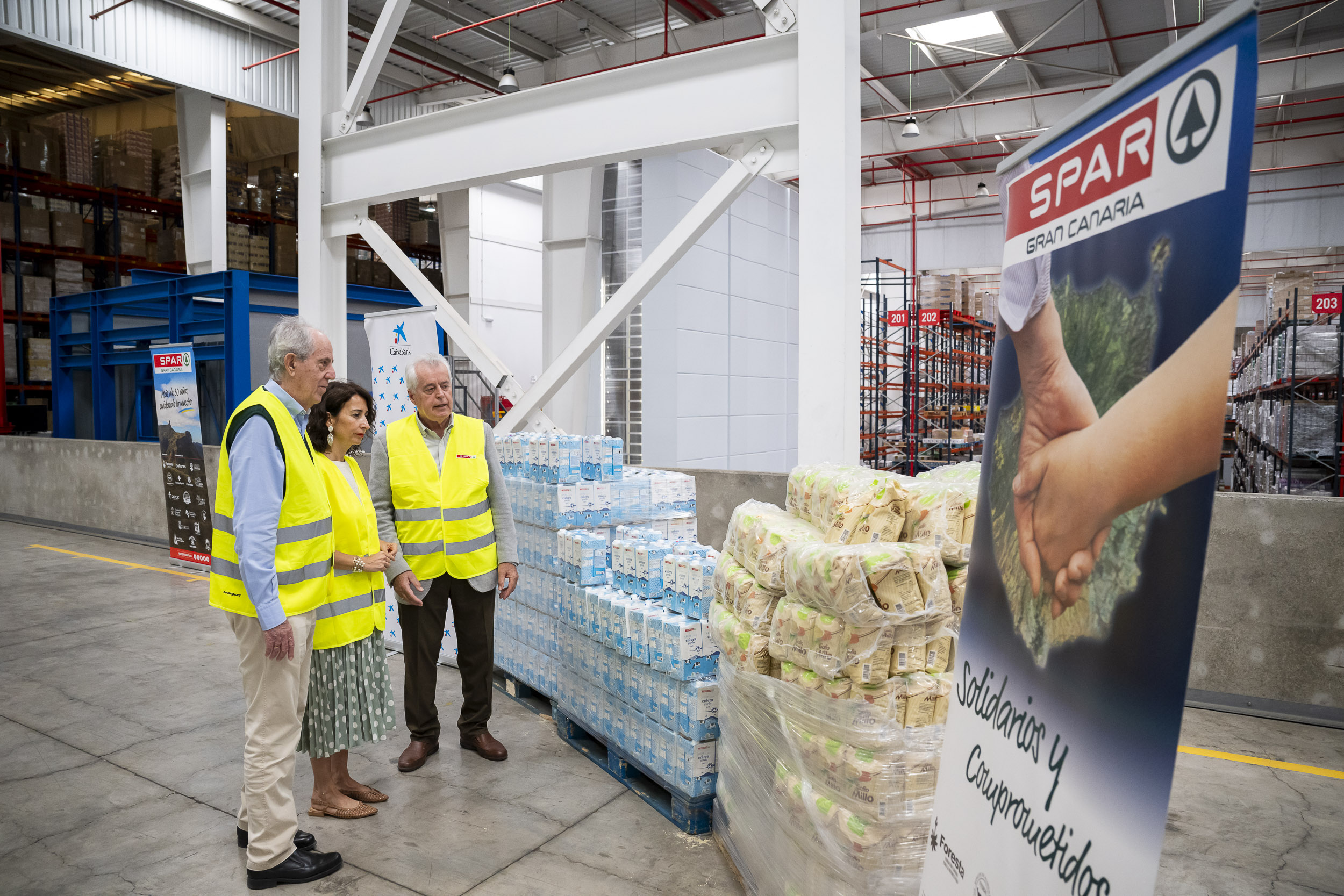 Durante el acto, el director de Banca de Empresas de CaixaBank, José María Herrero; la responsable de Acción Social de CaixaBank en Canarias, Olga del Pino López, y el presidente del Banco de Alimentos, Pedro Llorca, recibieron la donación de la mano del presidente de SPAR Gran Canaria, Ángel Medina; de la directora general de la cadena, Dunia Pérez, y del director de Administración y Finanzas de SPAR Gran Canaria, José Isaías Medina.