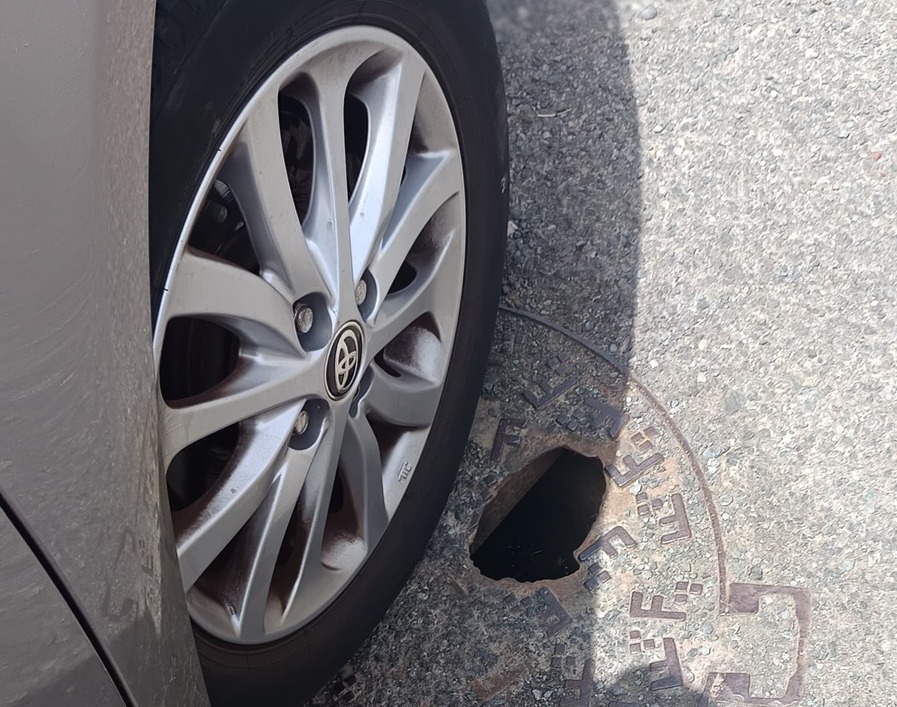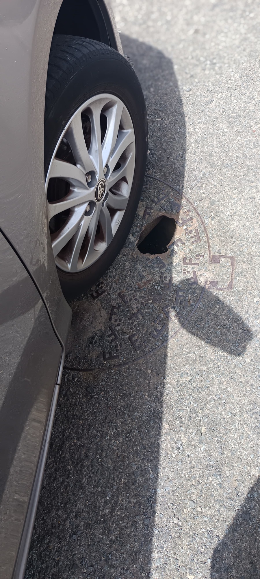 En la imagen remitida a este medio, puede observarse una rueda de un vehículo estacionado justo al borde del agujero, que se encuentra en la estructura metálica de una arqueta de saneamiento, la cual ha perdido parte de su recubrimiento superior. El hueco es lo suficientemente amplio como para provocar el hundimiento parcial de un neumático o una caída peatonal, especialmente en horario nocturno o en condiciones de poca visibilidad.