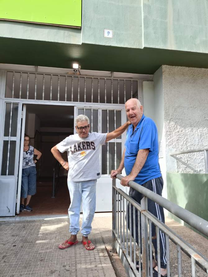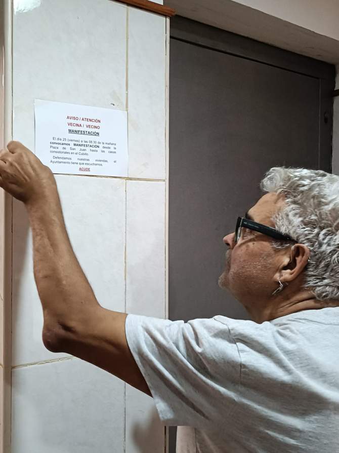 En los bajos del bloque, mientras se reparten los carteles, hay un grupo amplio de personas mayores. Vecinos que forman parte de la comunidad desde los inicios del bloque. Gente que, aun superando los ochenta y los noventa años, conservan la actitud luchadora de los primeros habitantes del polígono. Entre estas personas se encuentra Juan Francisco Jaizme quien, a sus 97 años, asegura que a acudir a la manifestación del día 25. “¡Claro que voy a ir! – dice con una sonrisa – Soy de La Isleta y allí somos muy ‘cabezúos’”.