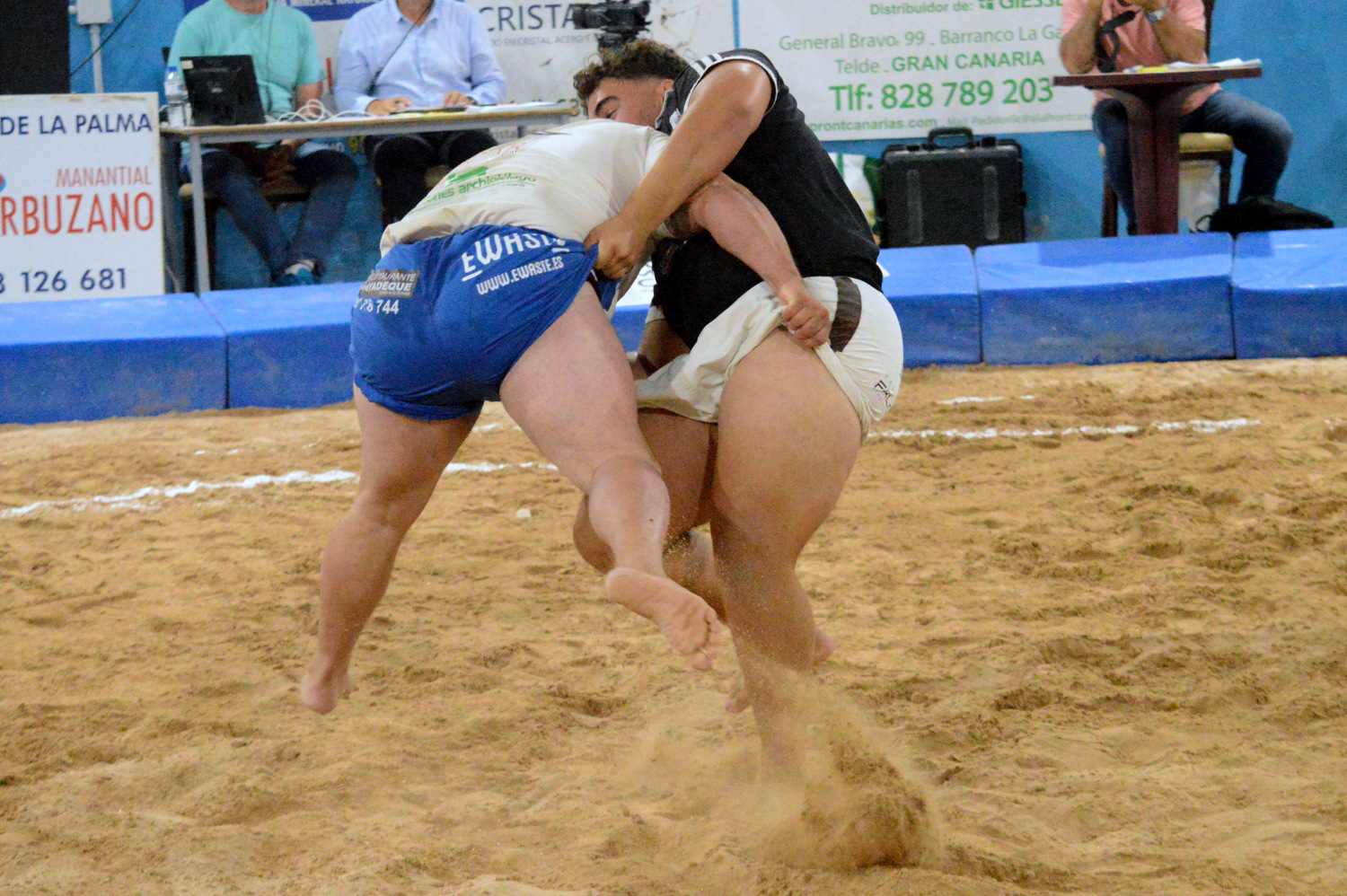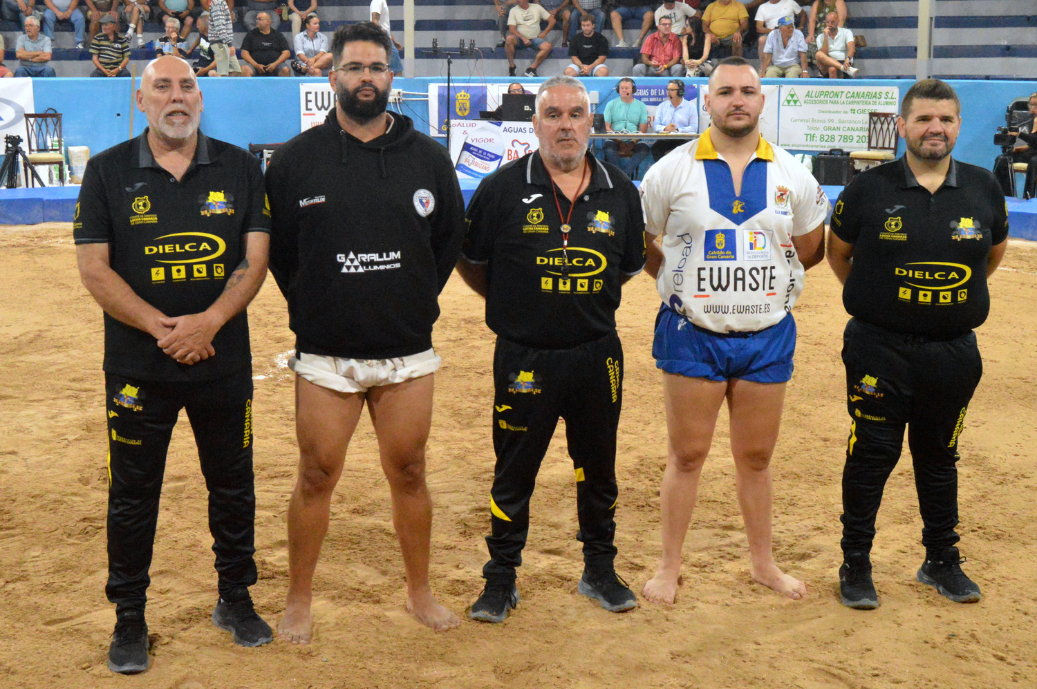Debido al fuerte calor, y las agarradas que ya llevaba en su casillero Miguel Reyes, tuvo que dar cinco minutos el colegiado al luchador del Unión Agüimes por lesión, que al regresar tiraba a Ndiaye (7-10). Fue el inicio de una pesadilla. El Castro Morales tenía fuera a sus dos hombres fuertes y al Agüimes le quedaban cuatro Goliiath: Miguel Reyes, Pedro Suárm Jonathan González y el más temible: el puntal C Aitor Lorenzo.