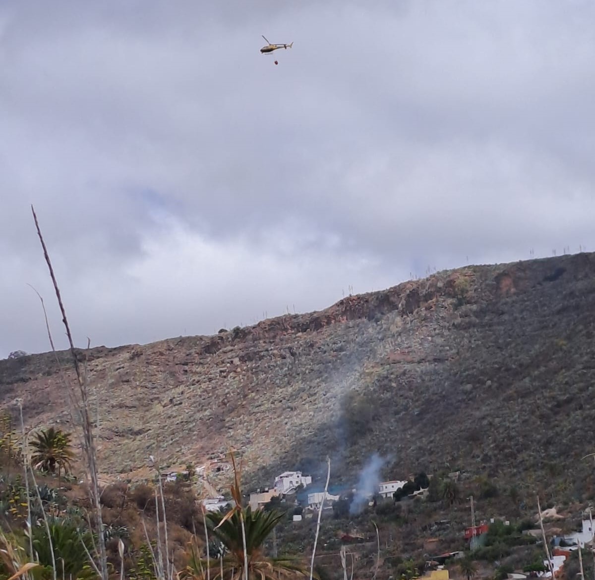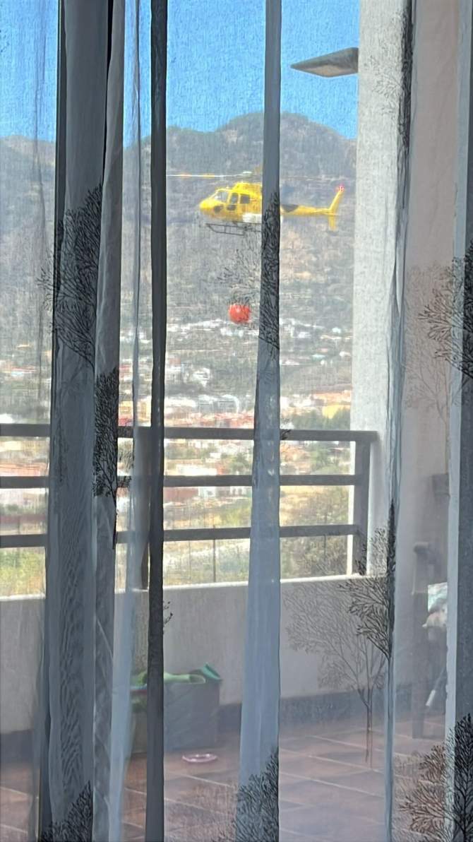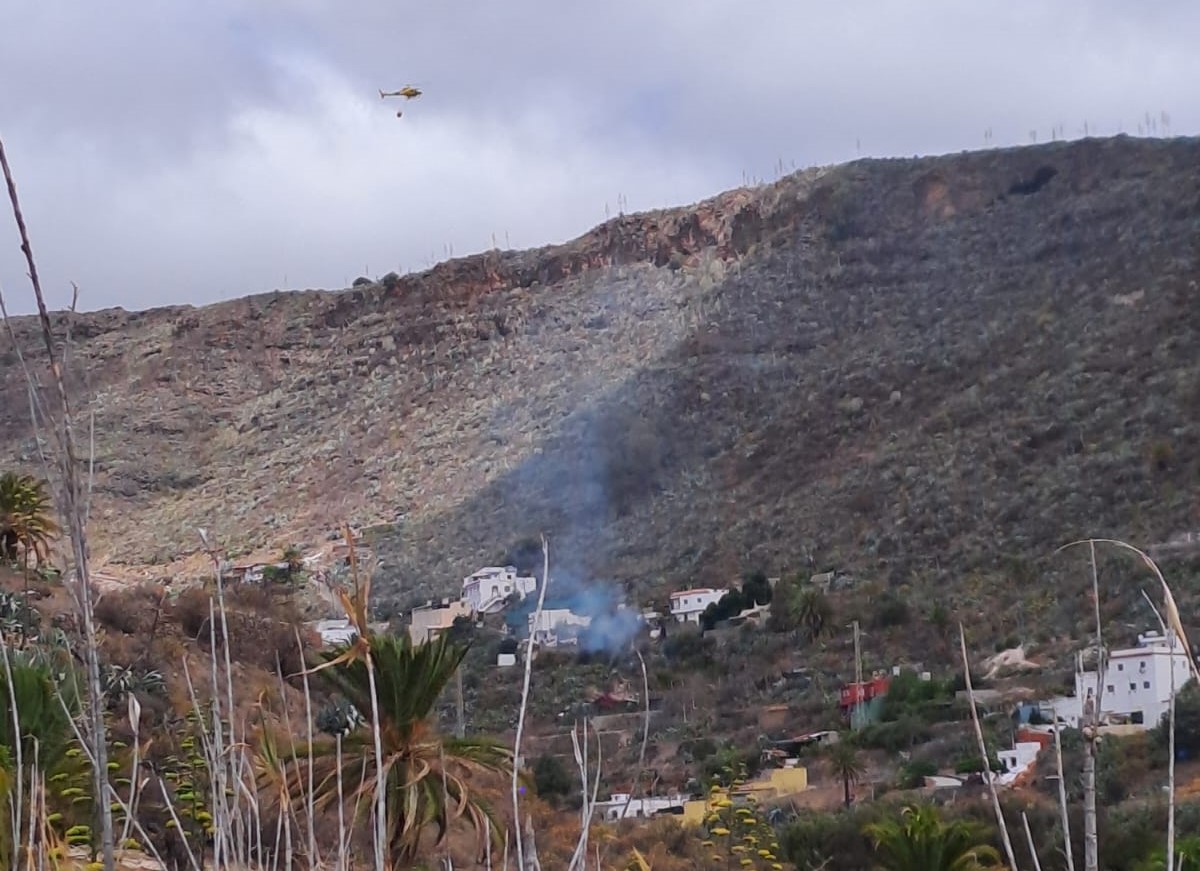 El helicóptero ha comenzado a realizar descargas de agua para sofocar el fuego y evitar que las llamas se propaguen dada la sequedad del terreno y el viento moderado del norte que sopla en la isla.