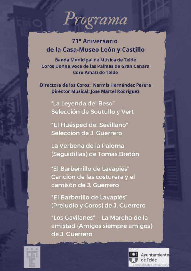 La Casa Museo León y Castillo organiza, junto con la Banda Municipal de Telde, el día 24 de julio, un concierto de zarzuela con motivo del 71 aniversario del citado museo dependiente de la Consejería de Cultura del cabildo grancanario.