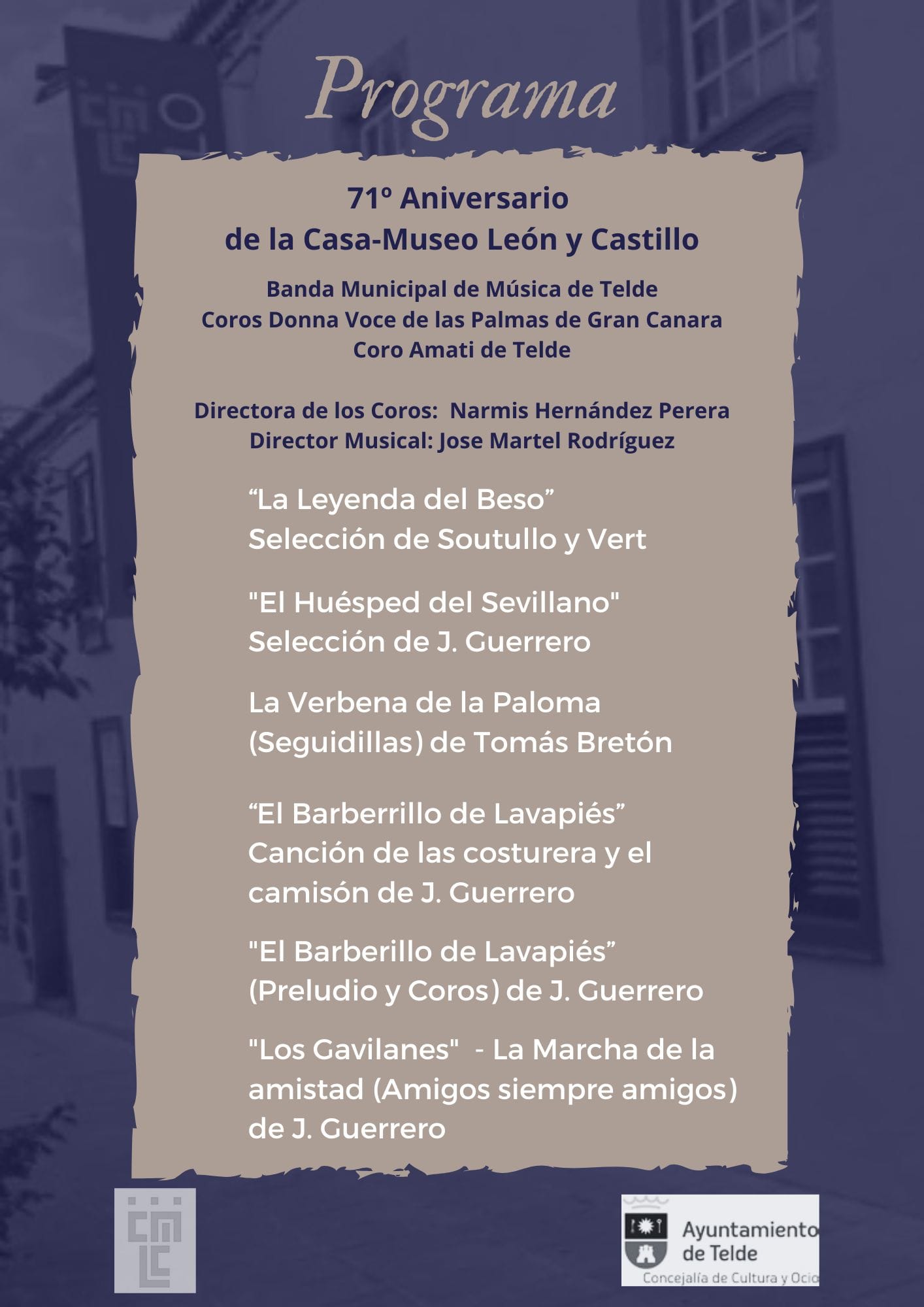 El director de esta institución José Alejandro Díaz expone en su intervención: "Agradecer al Ayuntamiento la cesión de este espacio de la Casa Condal del primer conde la Vega Grande. Agradecer al concejal Juan Pablo por la gestión realizada y al Ayuntamiento de Telde en la Concejalia de Cultura que dirige Juan Martel y no ha podido estar presente.Este agradecimiento es muy especial también, para la Banda Municipal de Música de Telde, que para los que han venido a otros actos de este ciclo de zarzuela, es la tercera noche de concierto, contamos con nuestra Centenaria Banda Municipal de Música que dirige José Martel de la que nos sentimos orgullosos los teldenses y grancanarios. El director José Martel fue realmente el ideólogo de este programa de zarzuela que vamos a escuchar y será un magnífico broche de oro a estos actos conmemorativos. Un agradecimiento especial a la importante colaboración institucional Cabildo -Ayuntamiento a cargo de Jesús Suárez de Gestel. Agradecimiento a los dos coros que nos acompañan esta noche, Donna Voce de Las Palmas de Gran Canaria y Coral Amati del Círculo Cultural de Telde, que después de dos meses de duro trabajo vamos a disfrutar este programa de zarzuela coro cuya directora, Narmis Hernández, ha hecho un trabajo excepcional. Destacar la idea del director José Martel de asociar composiciones de zarzuela vinculadas a efemerides importantes de la Casa Museo León y Castillo. Elegimos primero el nacimiento de Fernando León y Castillo, a continuacion el 18 de mayo el Día Internacional de los Museos, y esta noche celebrar, como dijo el concejal Juan Pablo, el 71 aniversario de la Casa Museo, fundada un 18 de julio de 1954 y que fue la punta de lanza de un proyecto cultural iniciado por Matias Vega Guerra, presidente del Cabildo en ese momento y que por fin dotó a esta isla de instituciones culturales que fueran de carácter público, las demás eran privadas en aquel tiempo. La Casa Museo León y Castillo fue el segundo museo con que contó el Cabildo de Gran Canaria después de la Casa de Colón. Vamos a escuchar zarzuela disfruten y buenas noches".