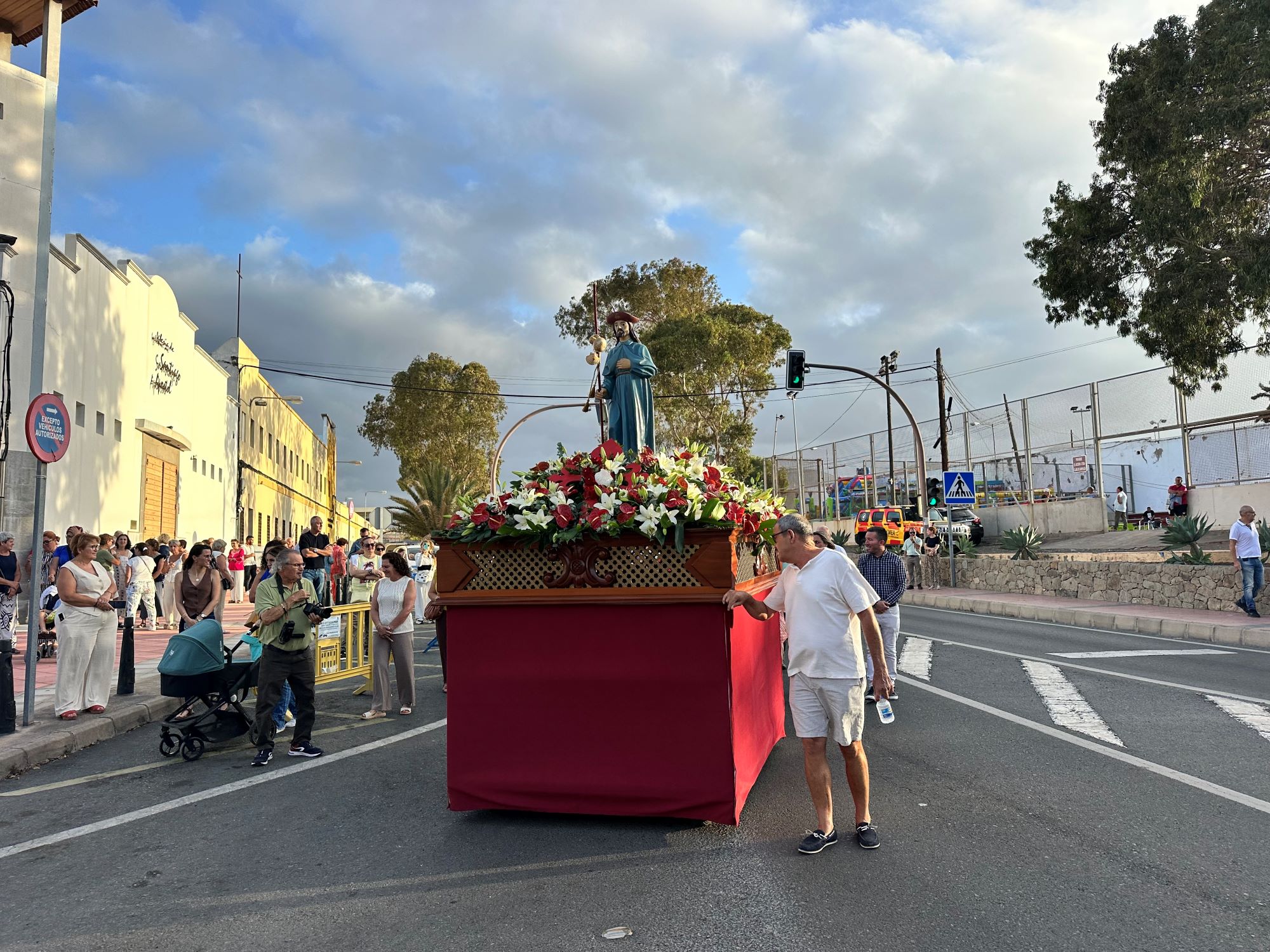 Finalizada la ceremonia, los tronos de ambos patronos salieron en procesión, impulsados por los feligreses. El recorrido se desarrolló por las calles principales de Lomo Cementerio. La Banda Municipal de Música de Telde acompañó el cortejo, aportando el componente sonoro que caracteriza a estas celebraciones.