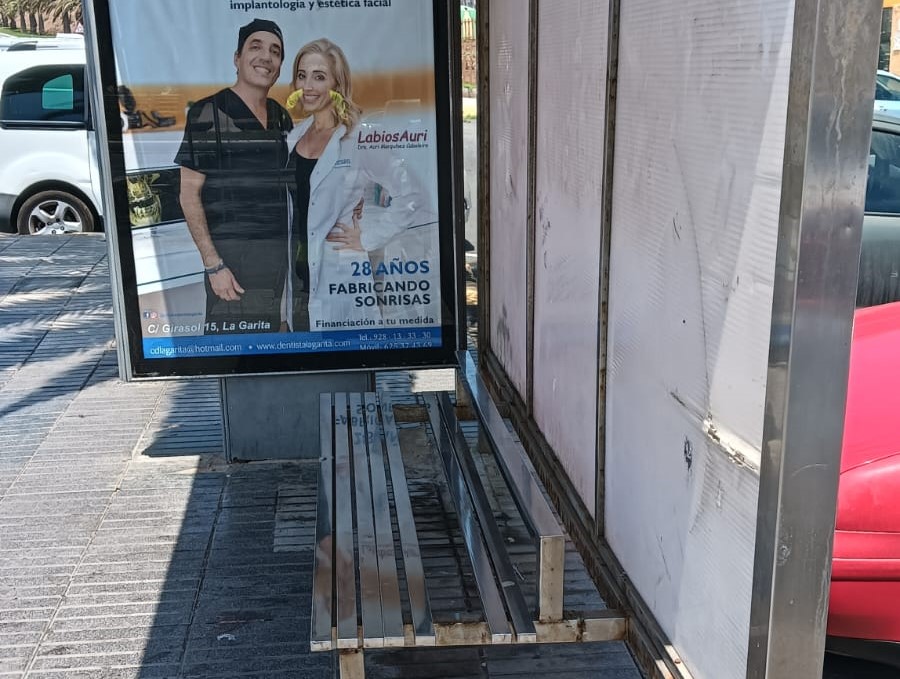 La imagen enviada por Santana muestra la estructura metálica del banco incompleta, con varios listones de acero arrancados, lo que impide el uso adecuado del asiento y representa un claro riesgo para los usuarios, especialmente para personas mayores, menores y personas con movilidad reducida. Esta marquesina se encuentra en una zona de alto movimiento de personasl, lo que agrava la peligrosidad del deterioro causado.