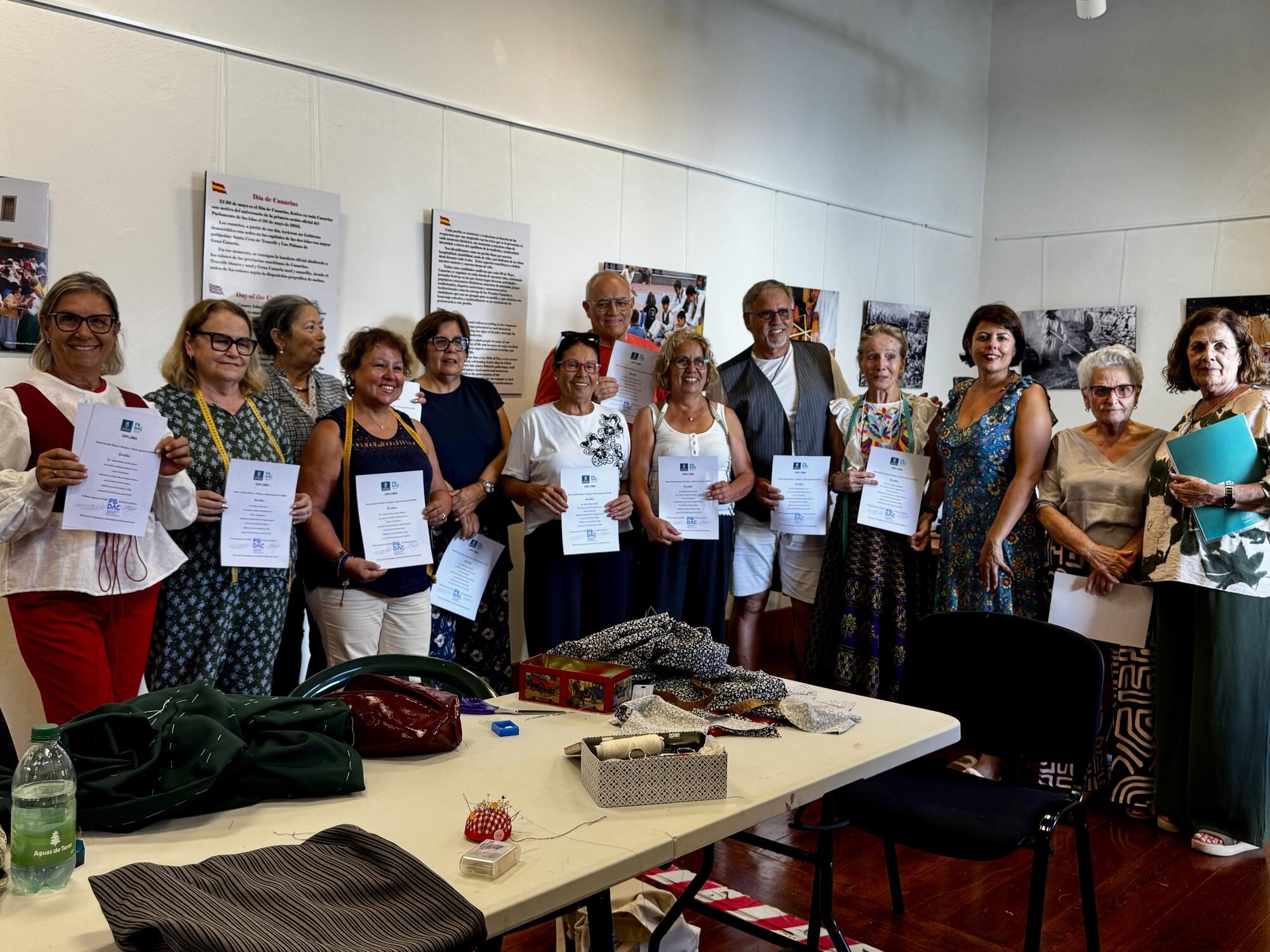 La consejera de Desarrollo Económico del Cabildo de Gran Canaria, Minerva Alonso, hizo entrega este miércoles de los diplomas a los alumnos que han finalizado el curso de vestimenta tradicional canaria impartido en el Centro de Artesanía de la Casa Condal de Telde por la veterana artesana Josefa Bravo de Laguna, de 85 años, una de las mayores conocedoras vivas del oficio.