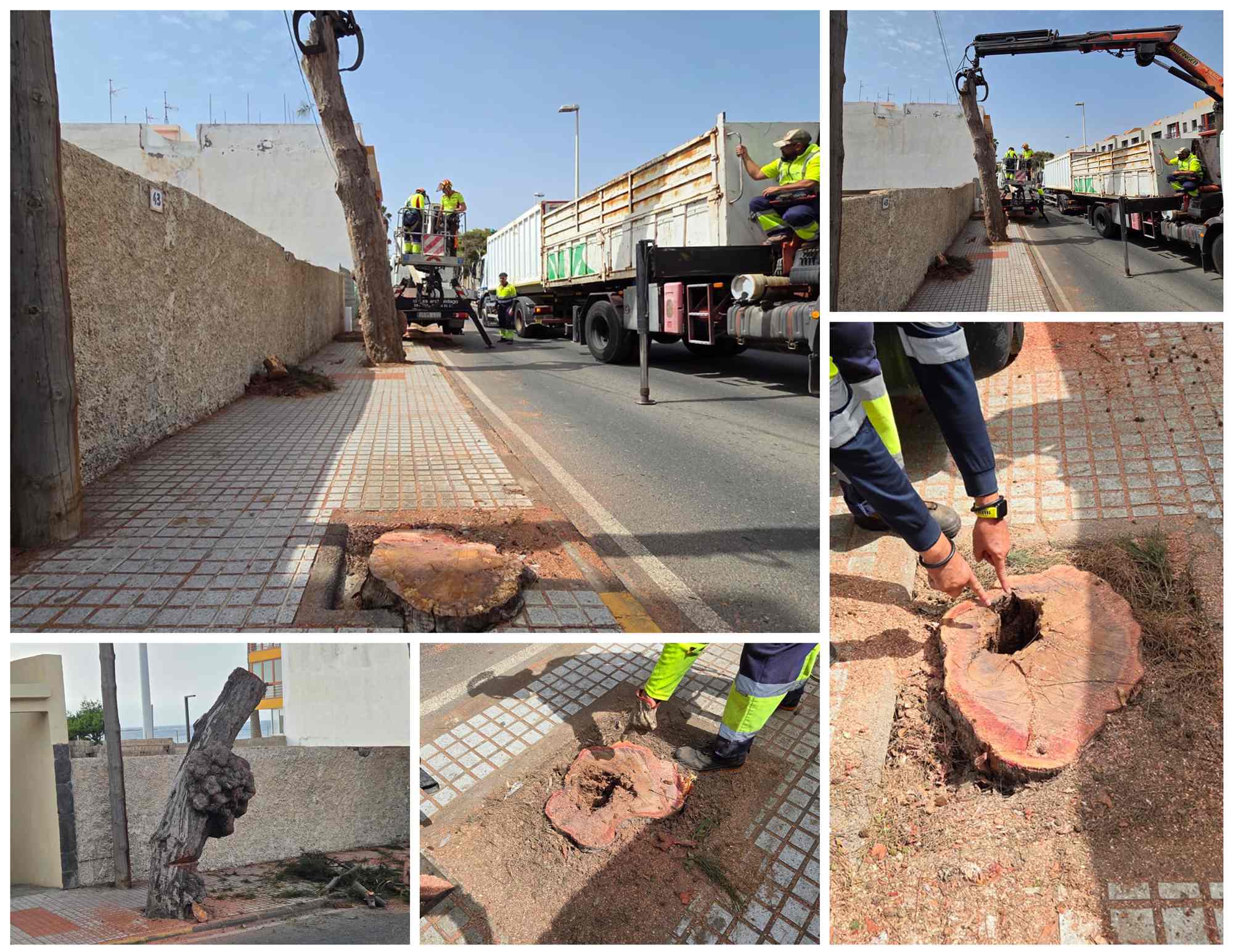 Reportaje gráfco del proceso de tala de cinco viejos pinos marinos en Salinetas