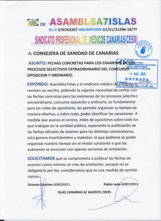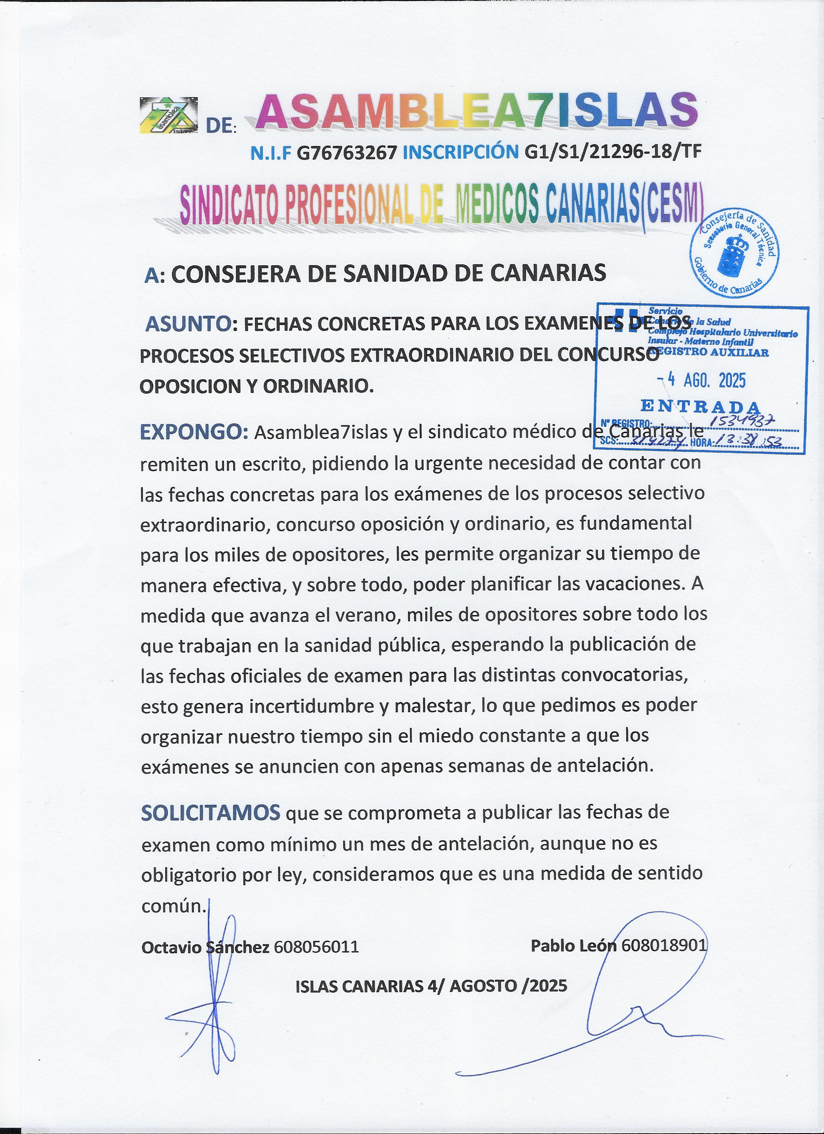 Asamblea7Islas y el Sindicato Profesional de Médicos de Canarias han remitido un escrito a la Consejería de Sanidad del Gobierno de Canarias en el que solicitan la publicación de las fechas de examen de los procesos selectivos extraordinario y ordinario de concurso-oposición en la sanidad pública del archipiélago. Según indican, esta información es esencial para que los opositores puedan organizar su tiempo y planificar sus vacaciones.