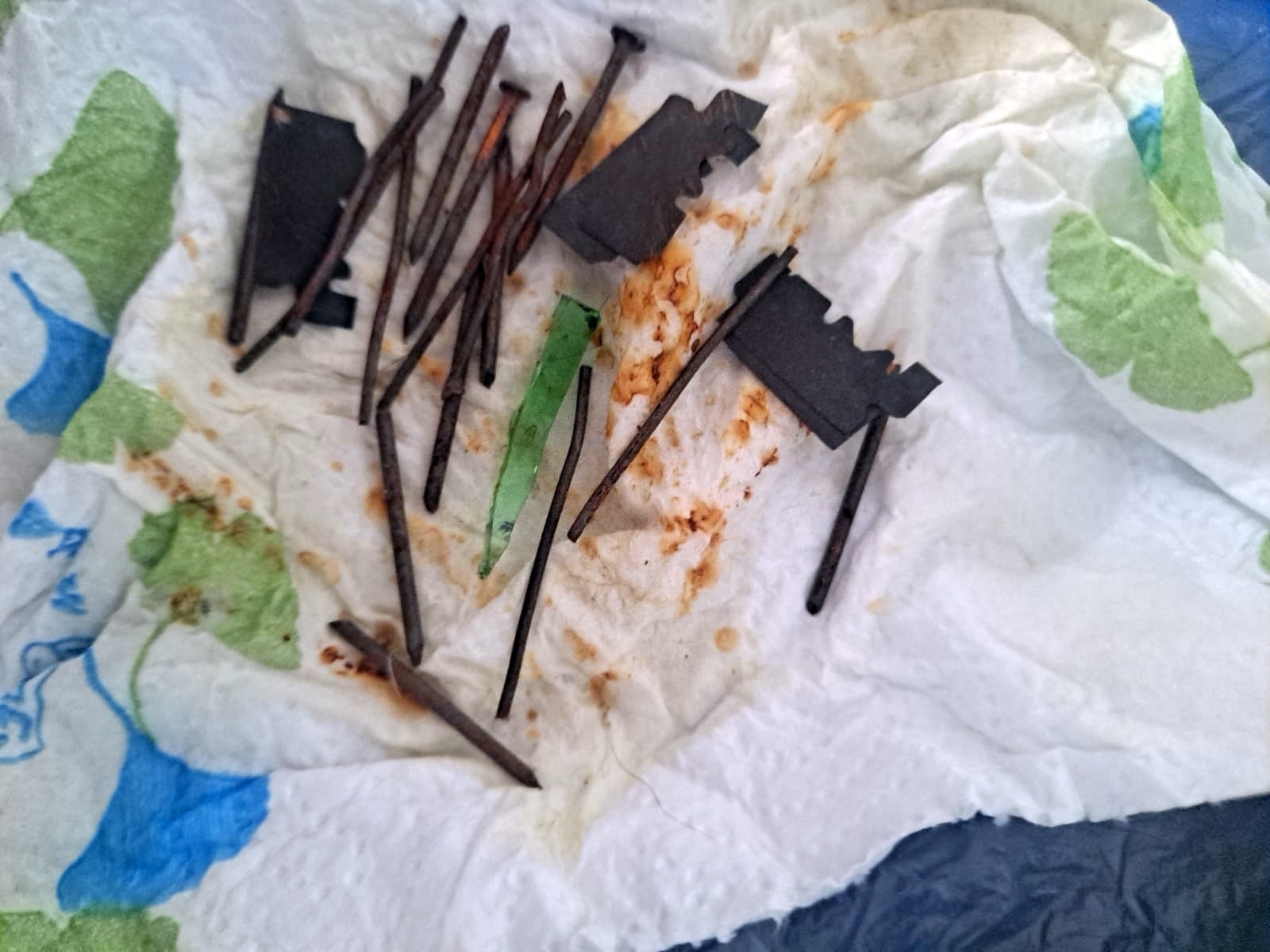 Una ciudadana de Telde afirma que su perro ingirió la semana pasada un cebo con tachas, cuchillas y cristales que le provocó vómitos con dieciséis tachas, tres trozos de cuchillas y un cristal. Relata que el animal fue trasladado al hospital veterinario de Los Tarahales, donde le practicaron una endoscopia en la que le extrajeron una tacha y tres trozos más de cuchillas.