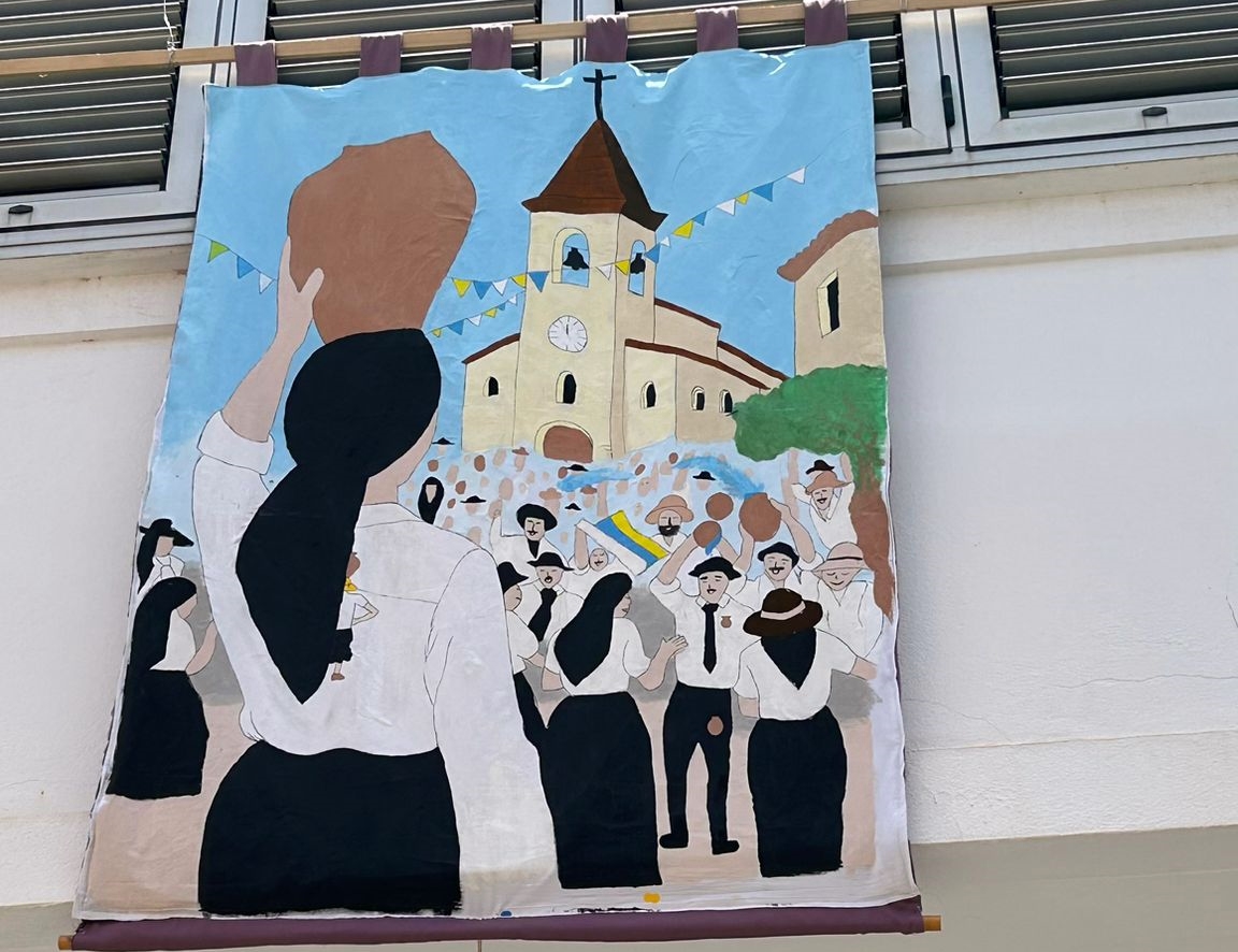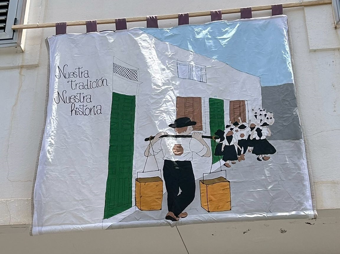 Este año, esa historia se ha plasmado en dos murales. El primero muestra a las hermanas y otros familiares en plena fiesta, entre música, cánticos y la algarabía de vecinos y visitantes. El segundo retrata un escenario cargado de simbolismo: la casa de la matriarca, fallecida hace unos años. Allí, cada final de traída, la familia guarda agua de la acequia para rociar la puerta en su honor. Acto seguido, una persona diferente rompe una talla frente a la entrada, cerrando así un ritual que combina recuerdo, respeto y unión.