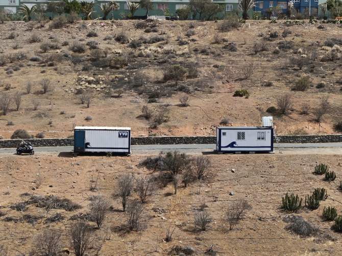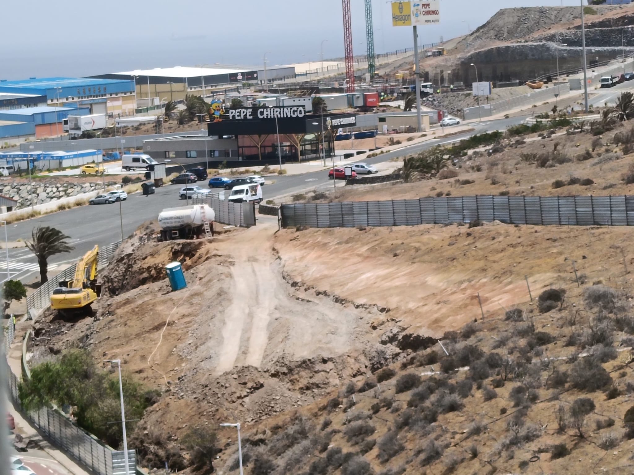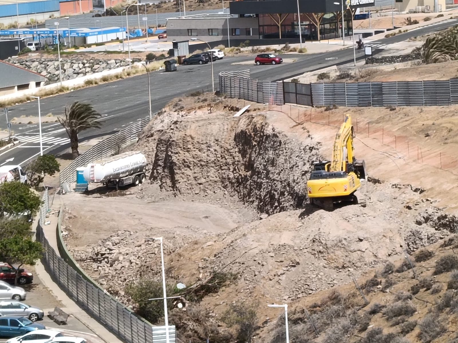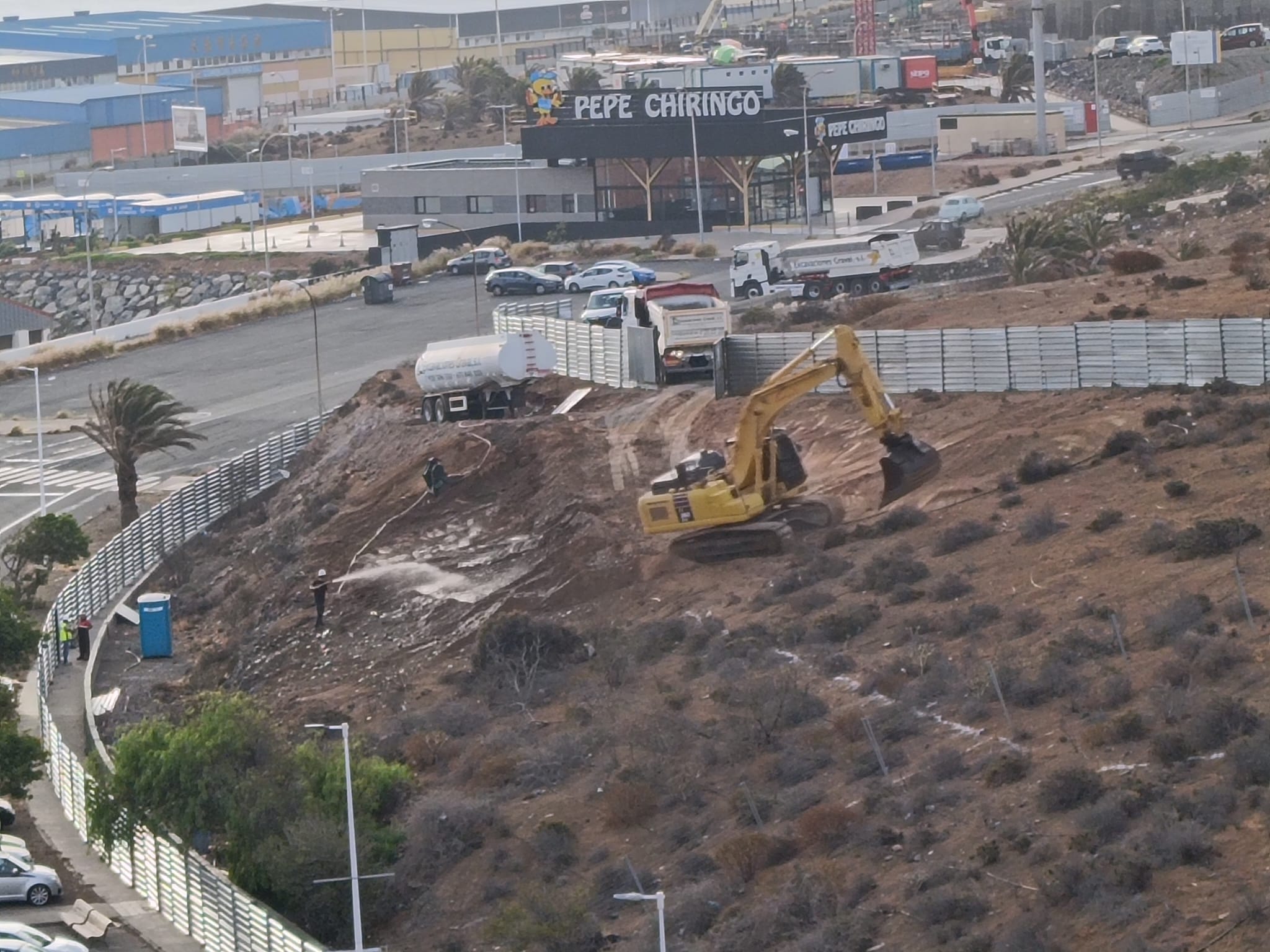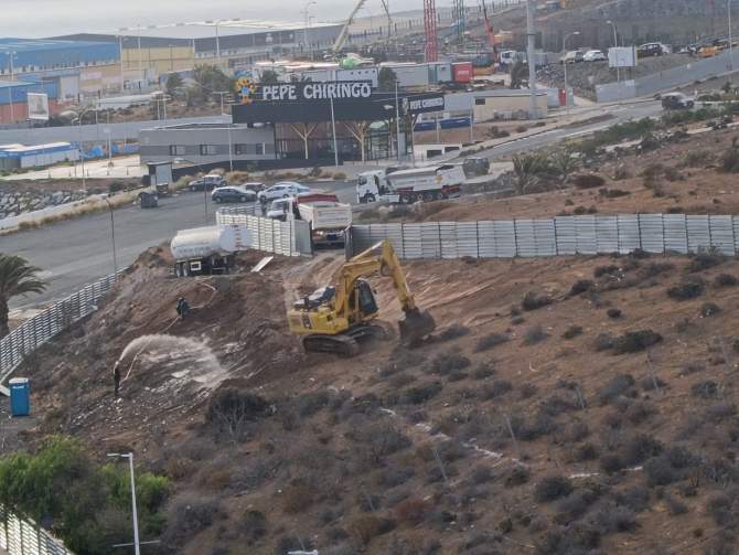 Las obras para la construcción de 73 viviendas de protección oficial en Jinámar avanzan a ritmo constante. Desde primera hora de la mañana, la pala excavadora comienza su trabajo a las 7.30 horas y se mantiene operativa hasta las 16.30 horas. Durante las últimas jornadas, varios camiones transportan la tierra retirada de la ladera —aunque aún no se ha confirmado el lugar de descarga— y un operario con manguera trabaja sin descanso para reducir al mínimo el polvo en suspensión.