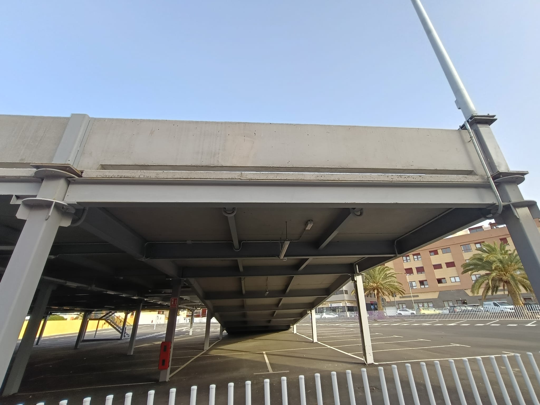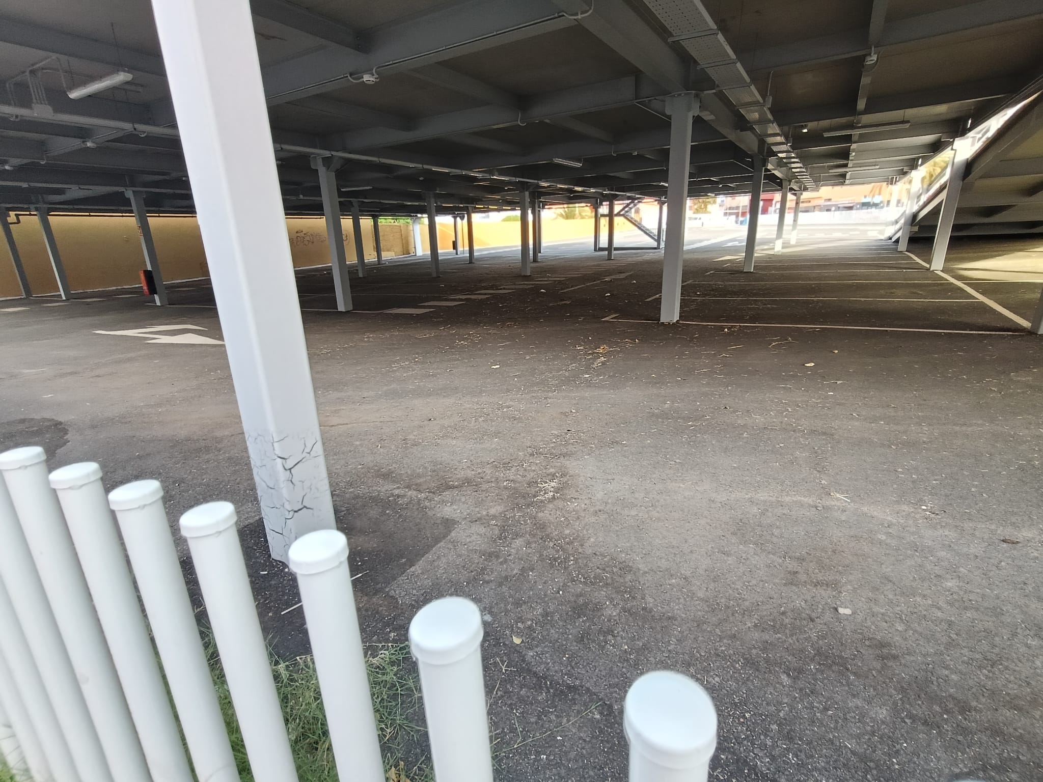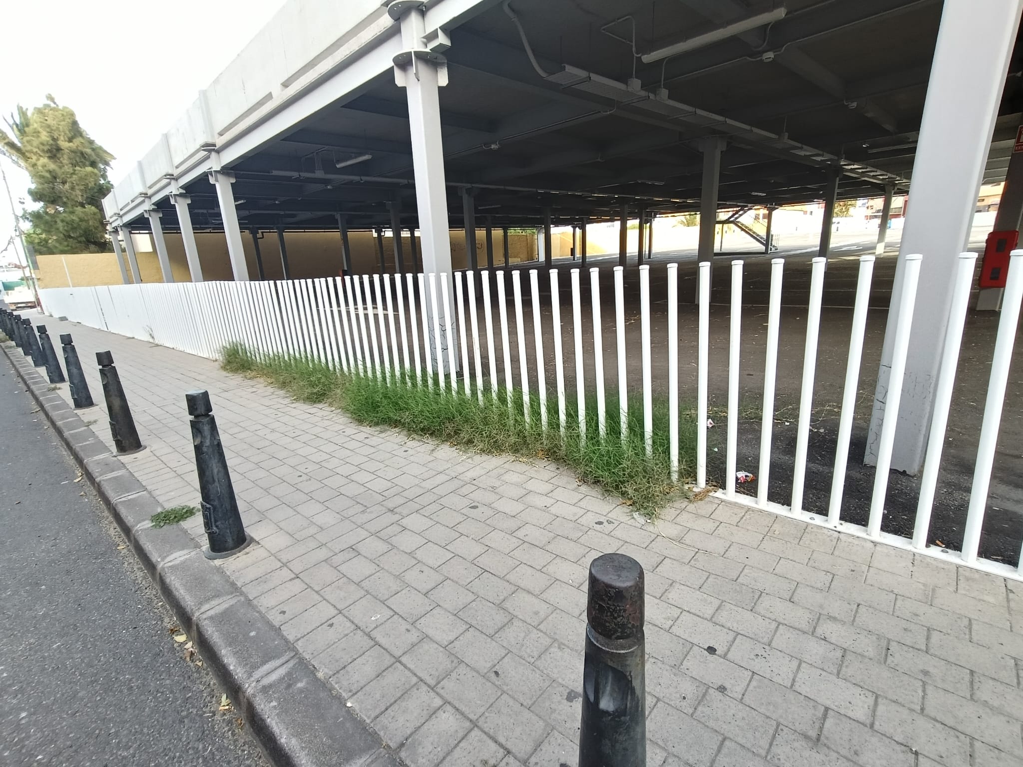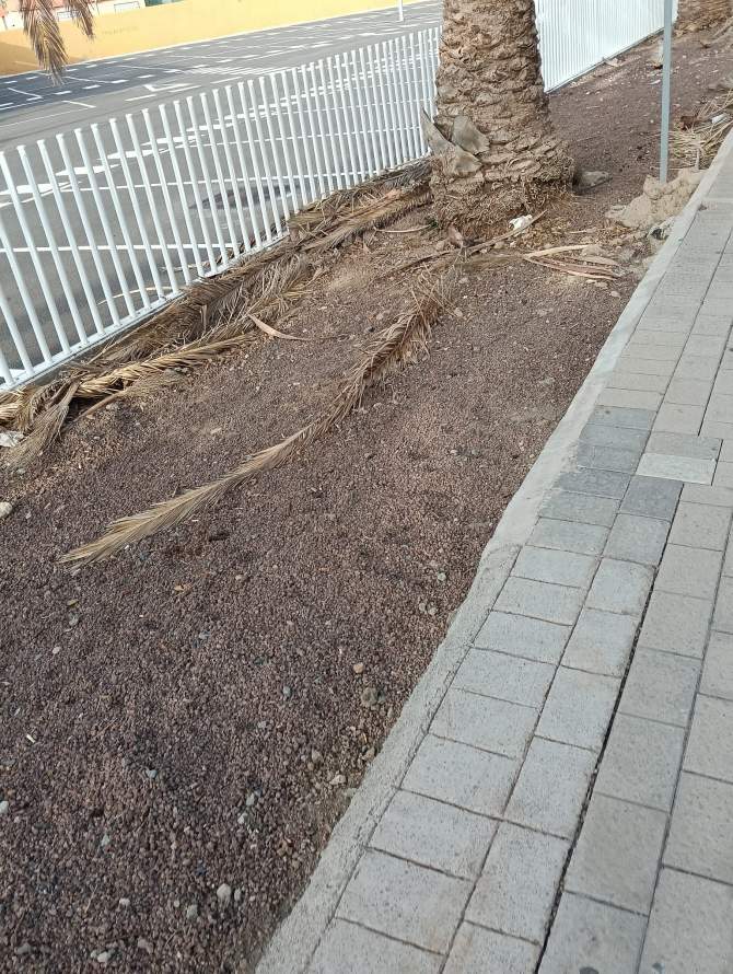 En la calle Licenciado Gilberto Monzón Mayor, lo que se supone que iba a ser una zona ajardinada, está llena de excrementos de perro y hojas de palmeras secas que se han caído, por lo que también es un foco de infección. Por último, en el interior se pueden ver las columnas deterioradas y oxidadas y suciedad por todos lados. Incluso los transeúntes aprovechan para cortar camino o grupos de jóvenes se ponen en las escaleras.