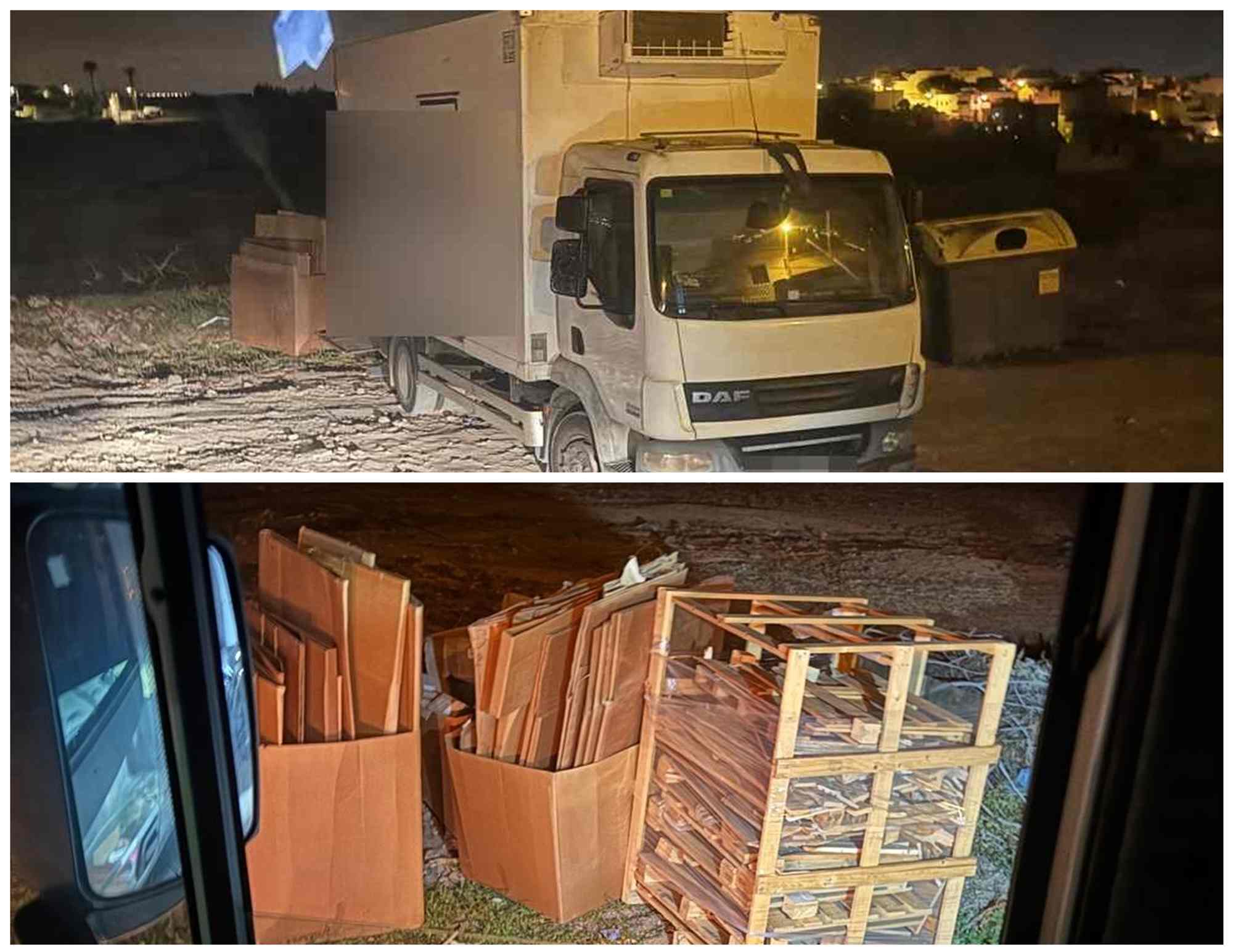 En las fotografías remitidas a TELDEACTUALIDAD se aprecia claramente un camión de reparto, matrícula XXXX-FDC, depositando grandes cantidades de cartón de cartón y estructuras de madera en el terreno. Los residuos ocupan parte del suelo sin ningún tipo de control ni medida de gestión autorizada.